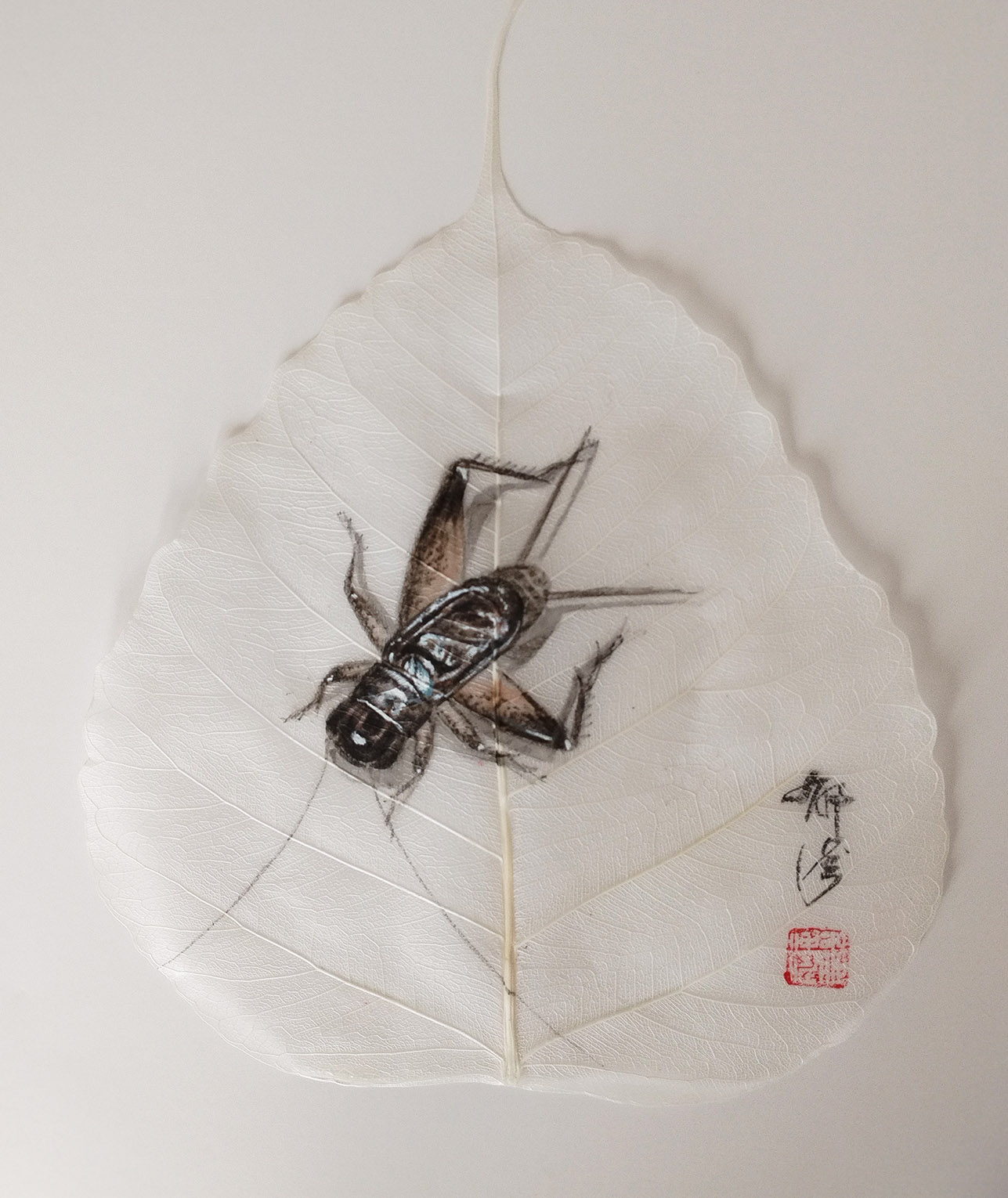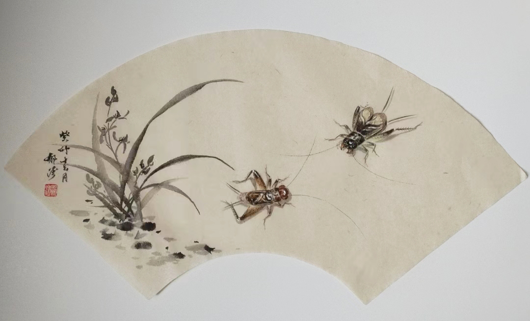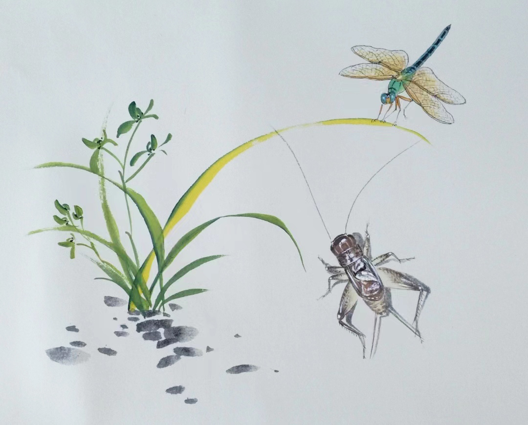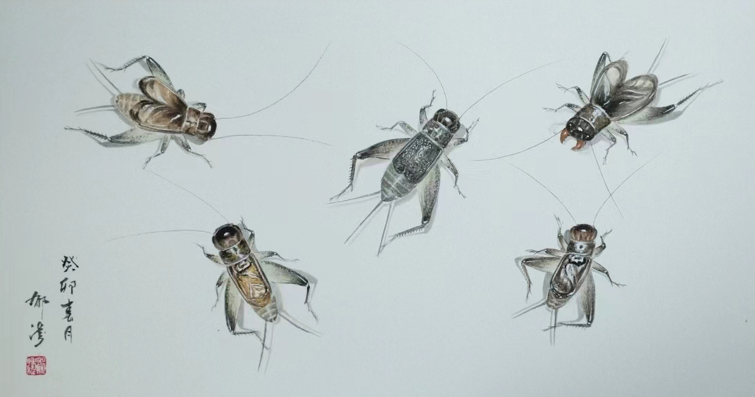 正所谓得其形不如得其神,得其神不如得其韵,得其韵不如得其自然!以此纵观郁涛先生的众幅蟋蟀画作,画中蟋蟀传神写意不失其真,形态时而旁附于草丛栖息,时而又三两嬉戏于花石之下,鞘翅下膜翅隐约可见微微颤动,足脚亦是可见前伸后蹬之状,头部一对触角一直一曲,好似探息对方所在之处,是谓栩栩如生,呼之欲出!当然,郁涛先生的笔下虫类也并非是仅此一种,其状态亦是截然不同,譬如蚱蜢的似腾似跃之感,蝴蝶的轻盈飞动之势,亦或是蜻蜓的点草点水之态,如此诸多虫物形神虽小,确也是各具于性情也!