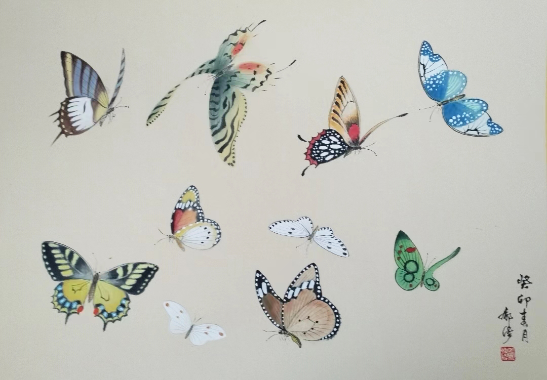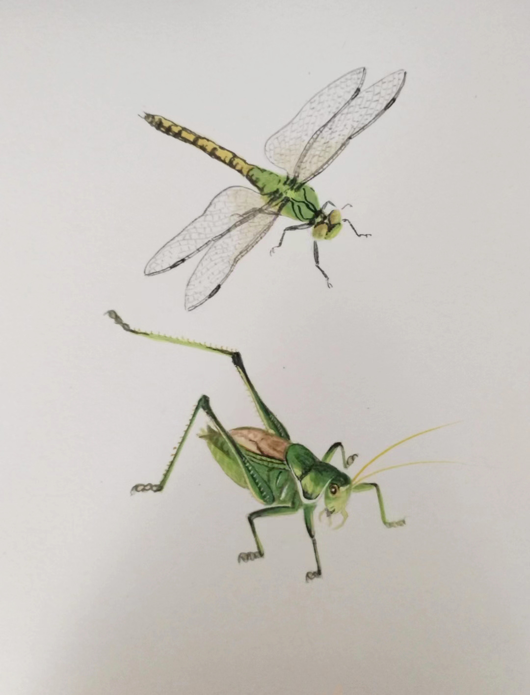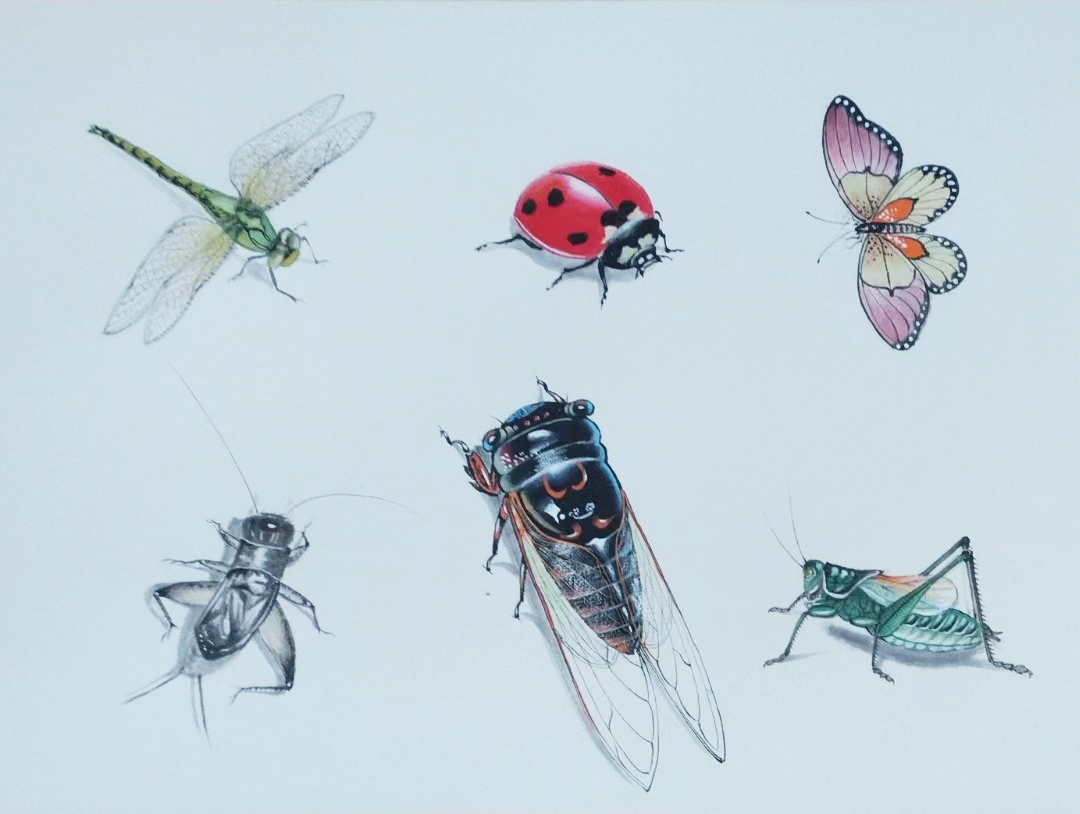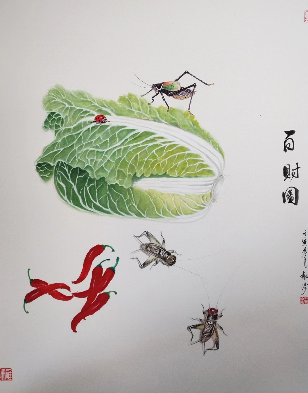正所谓得其形不如得其神,得其神不如得其韵,得其韵不如得其自然!以此纵观郁涛先生的众幅蟋蟀画作,画中蟋蟀传神写意不失其真,形态时而旁附于草丛栖息,时而又三两嬉戏于花石之下,鞘翅下膜翅隐约可见微微颤动,足脚亦是可见前伸后蹬之状,头部一对触角一直一曲,好似探息对方所在之处,是谓栩栩如生,呼之欲出!当然,郁涛先生的笔下虫类也并非是仅此一种,其状态亦是截然不同,譬如蚱蜢的似腾似跃之感,蝴蝶的轻盈飞动之势,亦或是蜻蜓的点草点水之态,如此诸多虫物形神虽小,确也是各具于性情也!