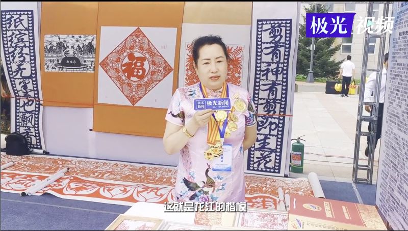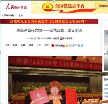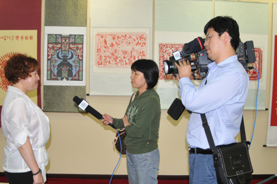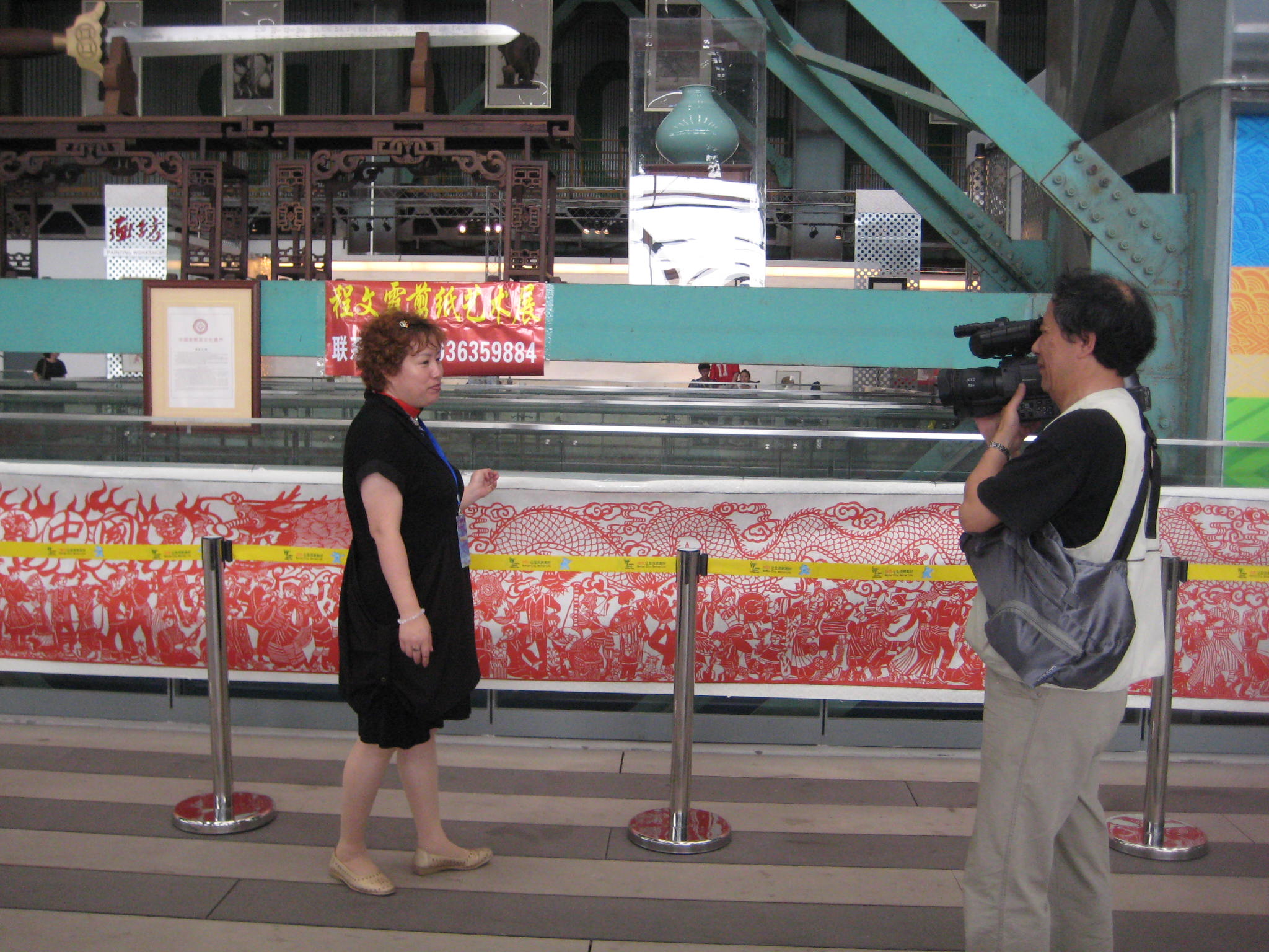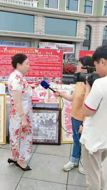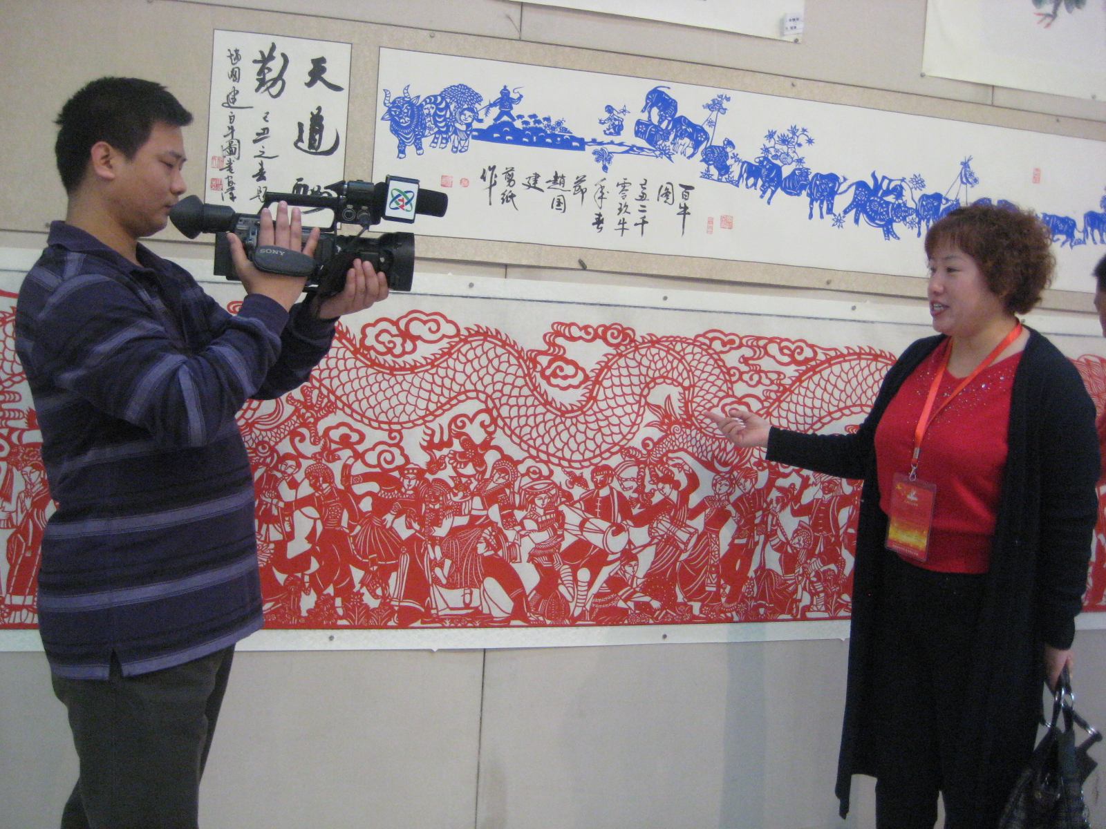 在入选全国剪纸大展中,程文霞接受中央电视台记者的采访