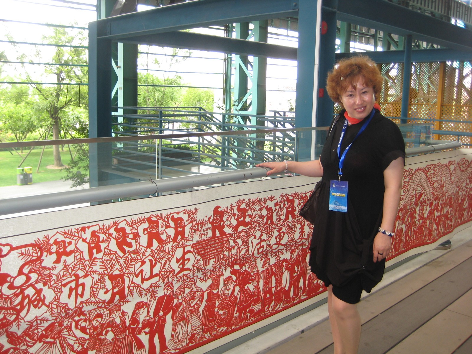 程文霞在2010年上海世博会时在她的剪纸长卷《城市,让生活更美好》前留影