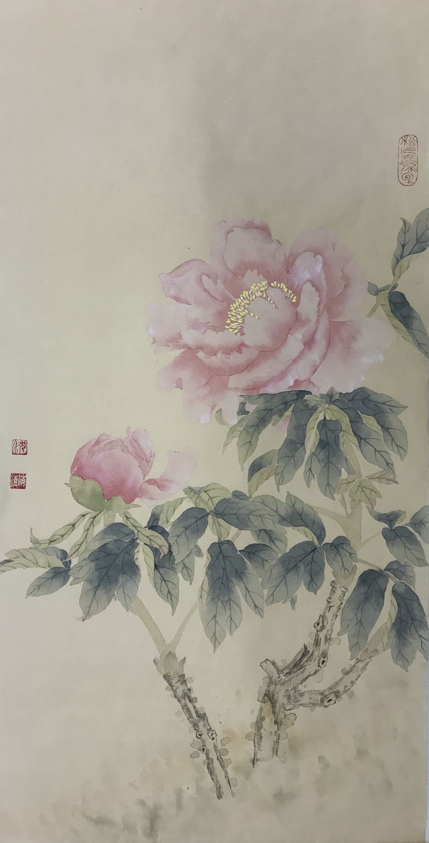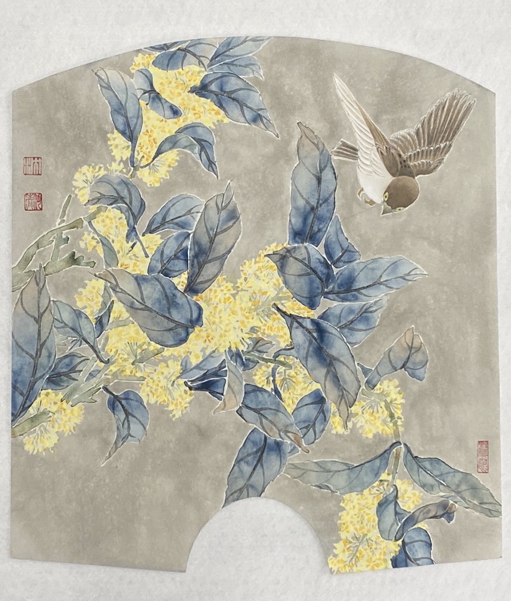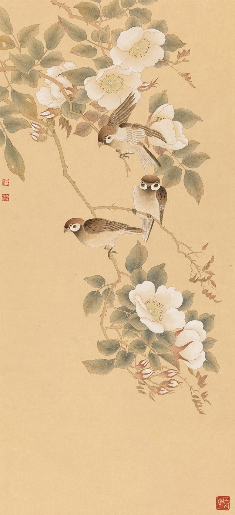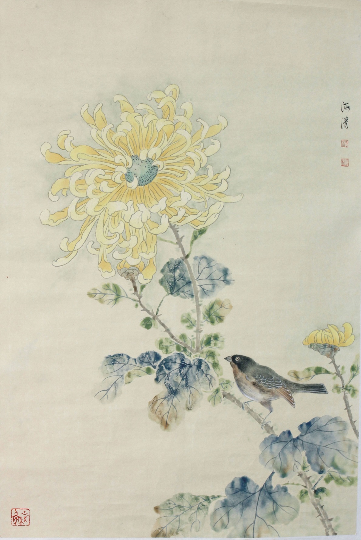 沈海清先生的工笔花鸟,最大的特点就是在于他能够通过工笔细腻技法来呈现其文人雅致。而平常画家若想要达到这种境界,深厚的文人修养则就是必不可少的存在,故而这也可以说是沈海清先生自身文化修养的侧面体现!继观其众幅工笔花鸟画作,画中是有着宋人院体的传神精妙,同时也更是有着元代文人的逸气凝神,技法以勾线和罩染为根本,线条精炼可见其功底之扎实,色染更是能呈现出一种丽而不俗和艳而不媚的美感氛围!而在一些菊花作品中,沈海清先生则又是能以一种工写结合的创作手法为表现,旨在为整幅画面构建出视觉层次和画面意境和双重感受!由此也可以看出,沈海清先生的工笔造诣绝非是简单的玩弄技法,而应是他在长期的创作实践中,受益于艺术修成和文化底蕴的积淀成果,此是谓参悟传统,静心而作也!