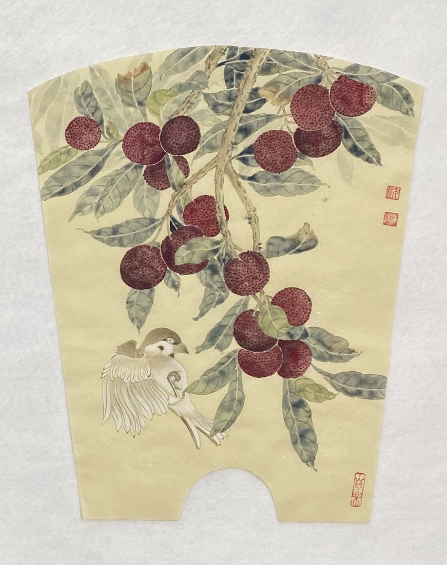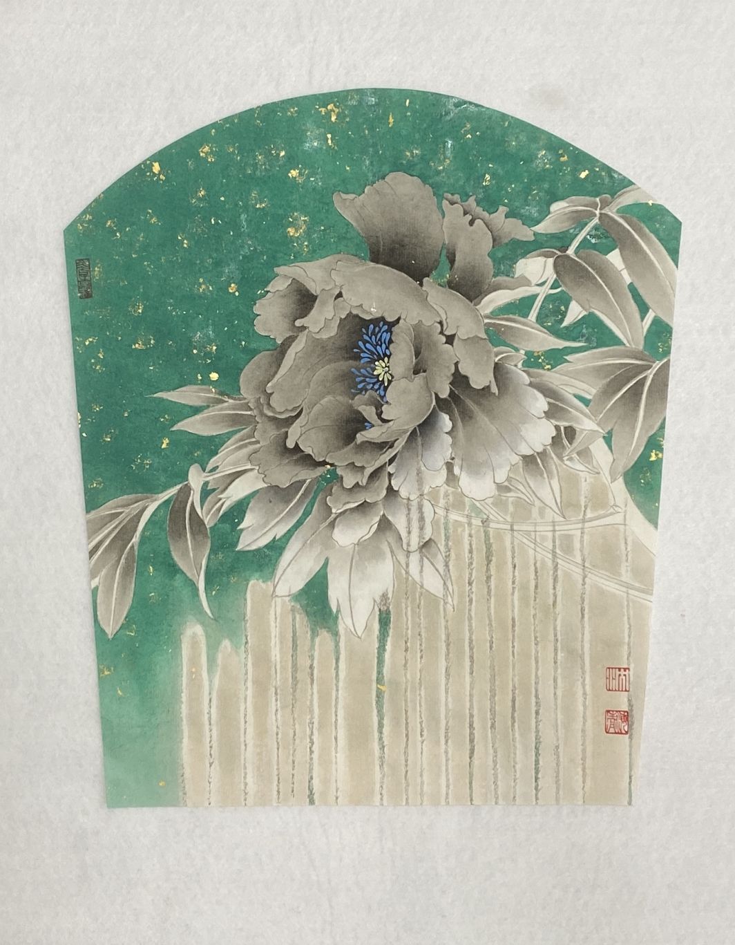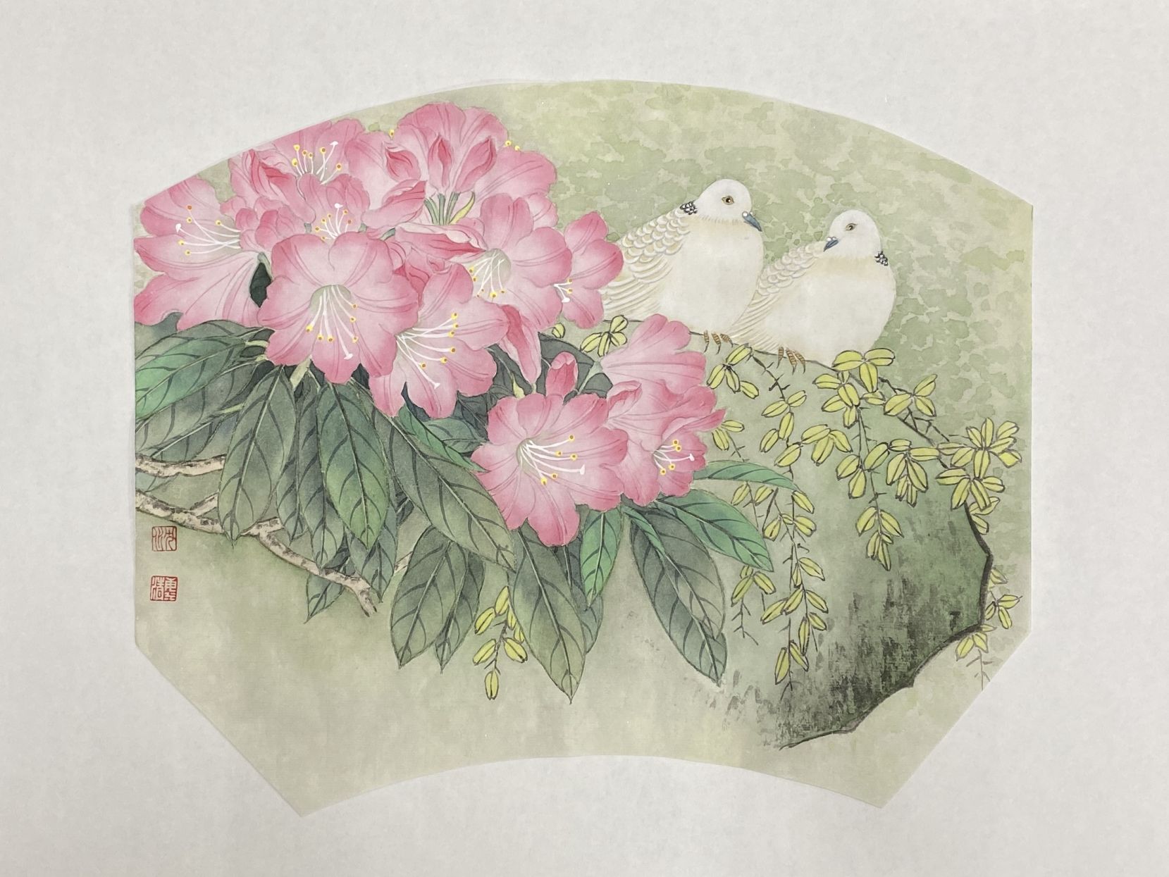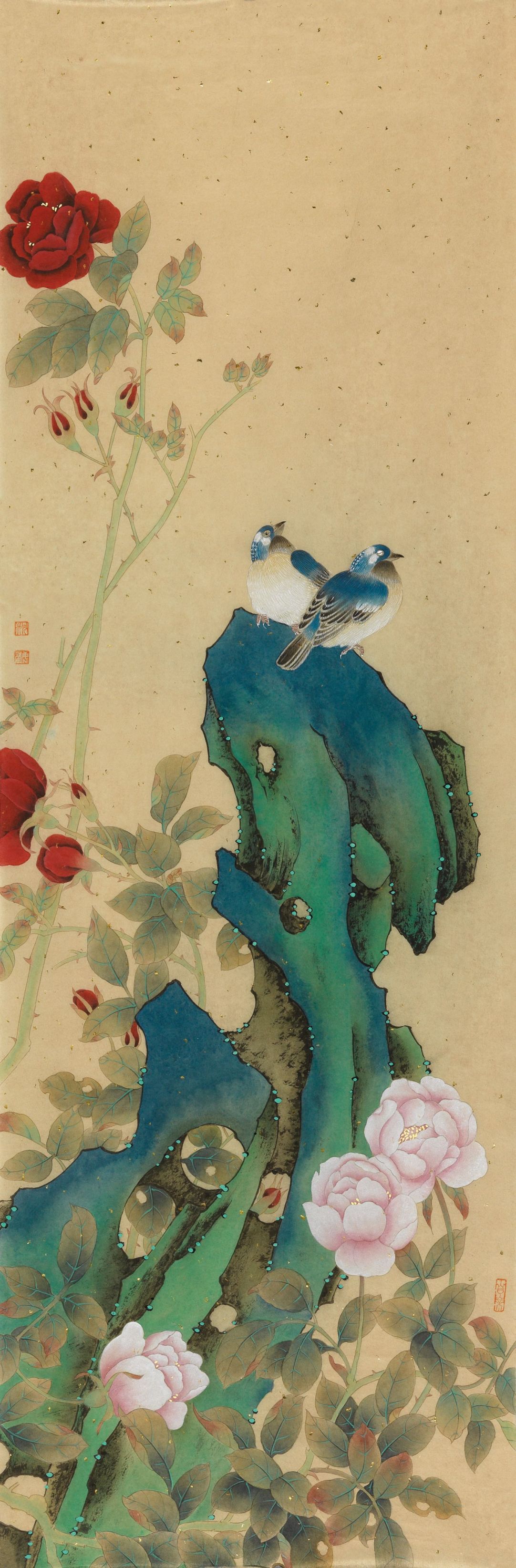 给人印象深刻的,则当属于沈海清先生的一幅月季双栖,此画不同于其它画作的小品结构,而是能以竖幅画面为立像,画中月季双色搭配,红者昂扬高枝,粉者簇拥而生。画面中心,则又以奇石而占据,质感洞达遒健,填色层次分明,奇石之上,两只鸟禽相依而立,或抬头凝望,或眯眼栖息,尤其是在鸟禽的羽毛细节刻画上,沈海清先生更是能达到一种纤毫毕现的程度,绘其神,构其势,此谓形神相依也!栩栩如生,跃然纸上!