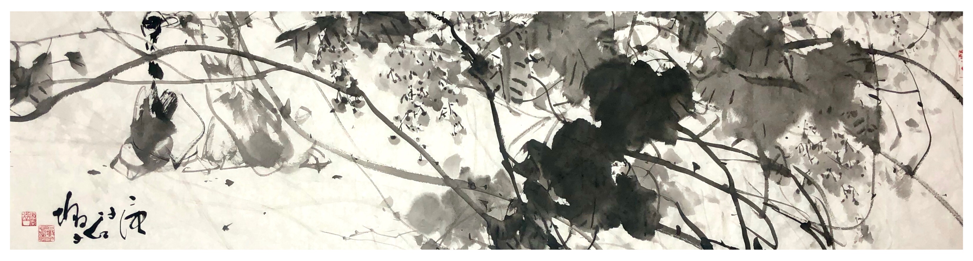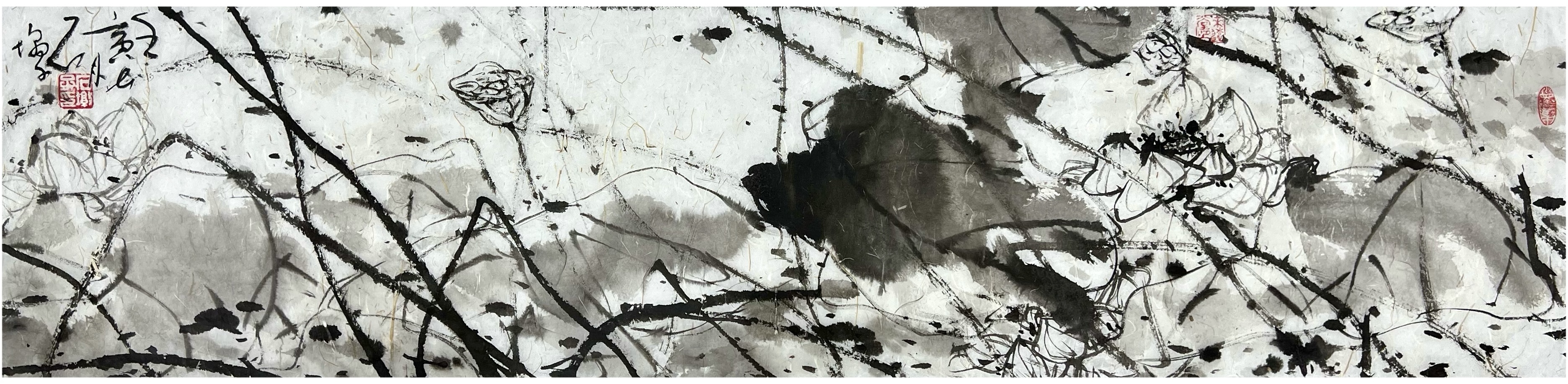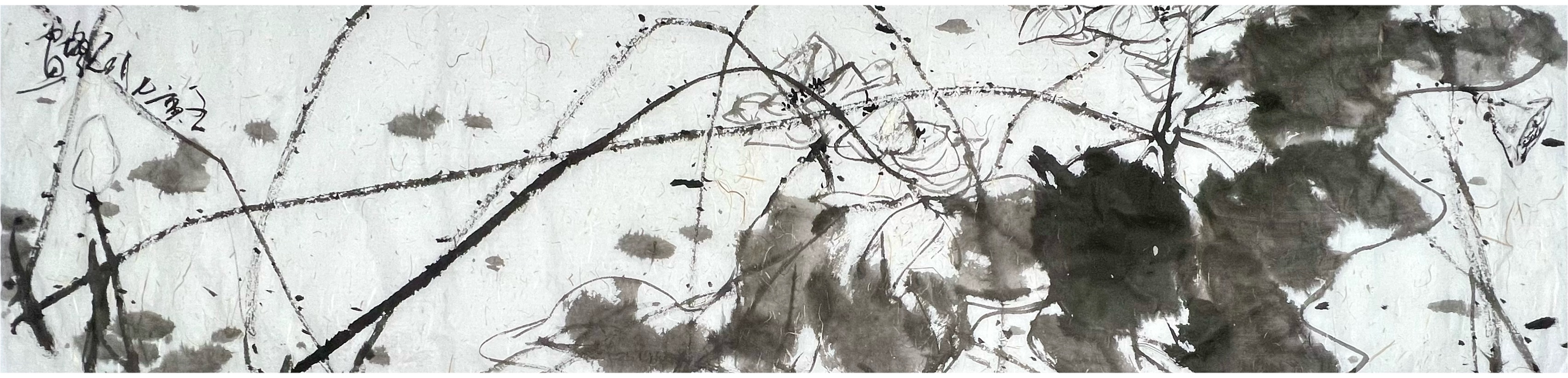 欣赏王国胜先生的一幅横幅荷花作品,画中荷花的整体构图是极为纯粹,初观虚盈为主调,继观空灵为生机,值此清幽池塘中的荷叶,可谓皆是有摇曳于自然也!而构建这一切的根基,则必然就是要论及王国胜先生的笔墨功底,寥寥数笔即可绘其神韵,水墨浸染,不枝不蔓,虚实合度,留白适宜,荷叶簇拥相映成趣,花卉质感逸气盎然,而那看似随意挥洒的浓淡笔墨,实则却是澄怀造境的真实体现!纵览之余,似有灵性注入其中,更似有诗情画意扑面而来,即出淤泥而不染,濯清涟而不妖,形神兼备,静心畅神!他以徐渭笔里有墨,墨里有笔的娴熟技法,放手写心作荷影,虚实相生有无相成,正是空生妙有的绘禅真谛。又承续八大画法的孤绝恣意,让笔墨的洒脱成为浮香曲岸的镜像。笔墨写禅风,明心见性。从历史的深处汲取营养,于自己的心田生化感念,兼蓄油画的抽象主义塑造原理,把一池墨荷画得相当精微要妙,正是亘古未有、孤标尘外的时代美学倩影!