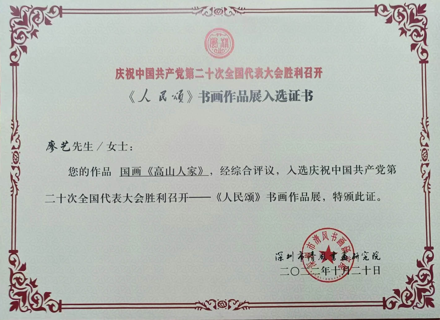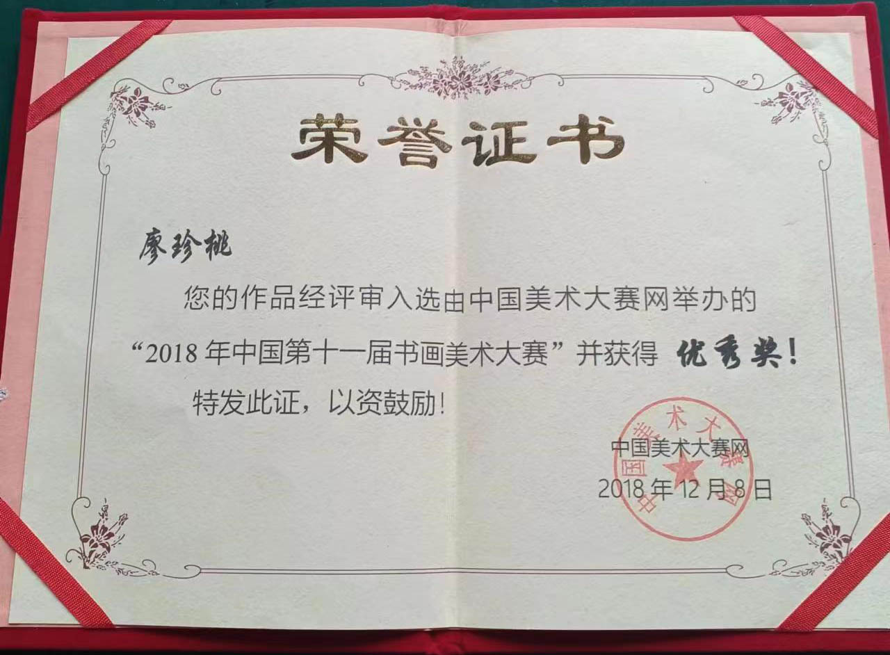 邀请赛评选中经专家评委评审荣获二等奖,作品典藏,2017年全国第一届中华杯民俗文化大赛,作品获银奖, 2018年参加中国美术大赛,作品被评选为最佳优秀奖,2019年新中国成立70周年祖国颂全国书画大赛,作品获二等奖,2019年参加由中国教育电视台(CETV)《泼墨中华情》组委会举办的迎建国七十周年书画大赛,书法作品《沁园春·雪》获优秀奖,同年参加《中国书画报》、国家邮政、电信部门出版的《庆祝中华人民共和国成立七十周年》珍藏邮品编审,共二十幅优秀书法作品入编,并被专业机构和国内外收藏家收藏。2020年4月应中国硬笔书法协会之邀,出席 “ 弘扬中华文化,践行大书法——中硬办学指导中心全国写字教师培训交流会 ”,并与会发表意见。