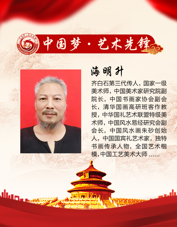 海明升,齐白石第三代传人,国家一级美术师,中国美术家研究院副院长,中国书画家协会副会长,清华国画高研班客作教授,中华国礼艺术联盟特级美术师,中国风水易经研究会副会长,中国风水画朱砂创始人,中国国宾礼艺术家,独特书画传承人物,全国艺术楷模,中国工艺美术大师,当代最具收藏价值艺术家,2021当代中国书画百杰,中国实力派书画家。