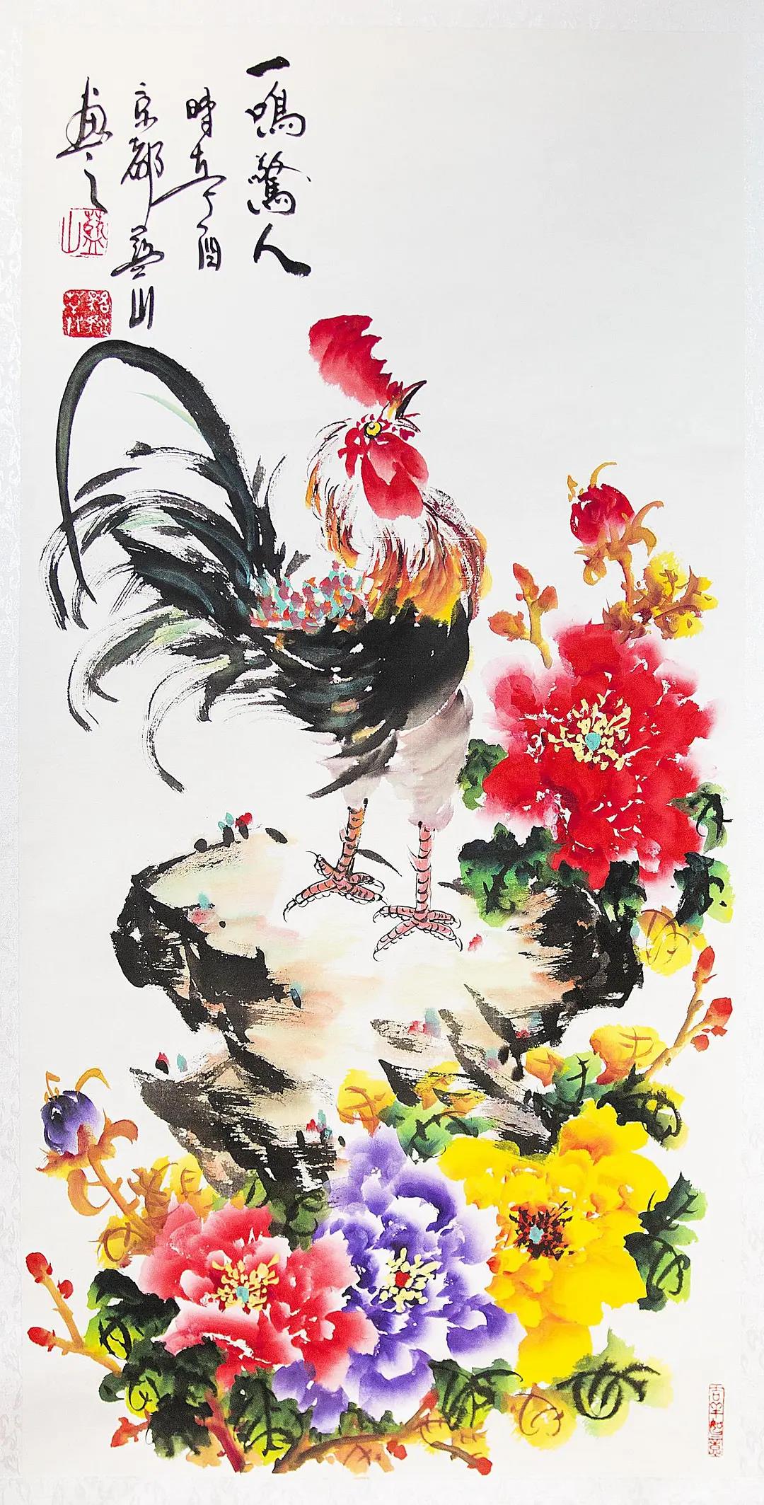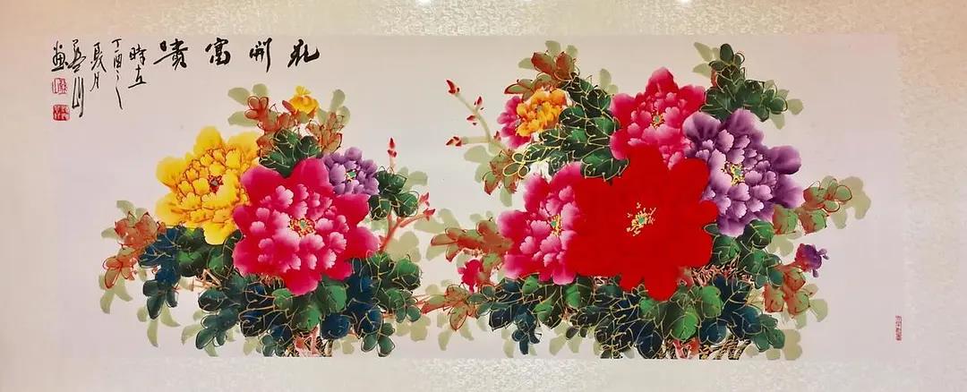 2017年 春节前夕慰问国旗护卫队,赠送作品两幅。作品《盛世中华》牡丹图被悬挂在天安门城楼