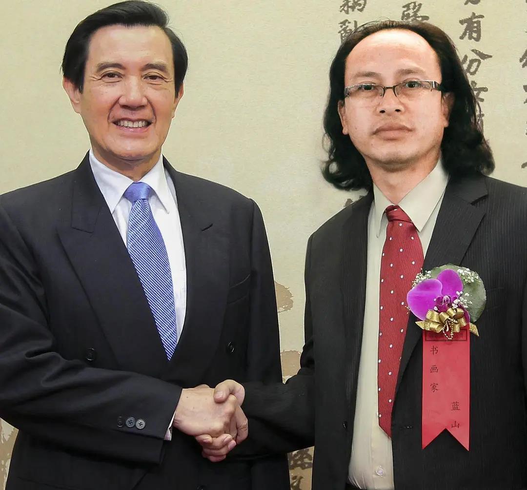 2013年 参加台北两岸艺术交流活动,国画牡丹作品被国民党主席马英九收藏并合影留念