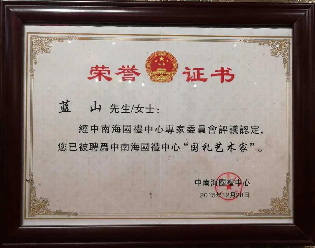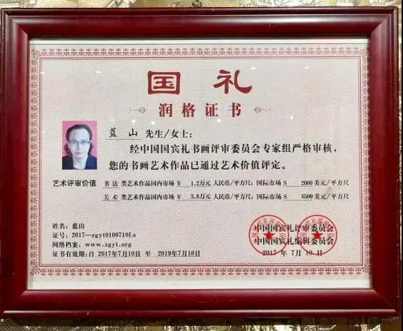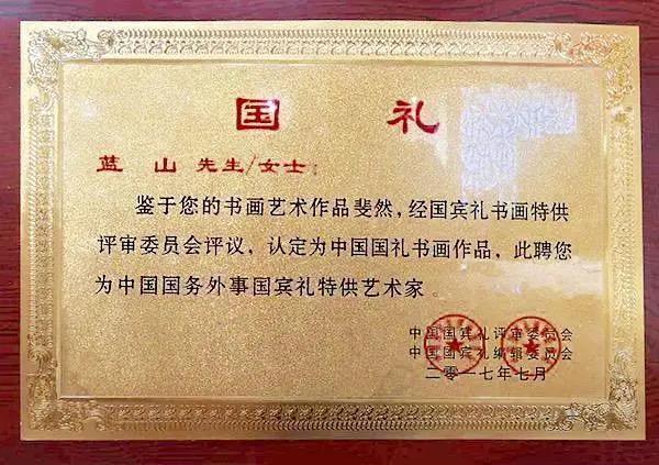 2017年 经中国国宾礼书画评审委员会评议,认定蓝山为中国国务外事国宾礼特供艺术家