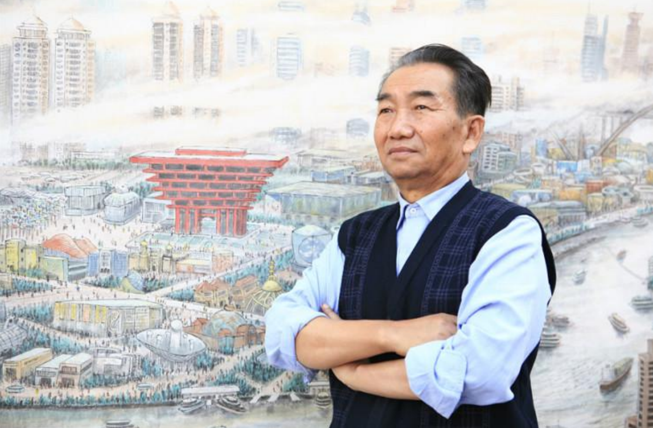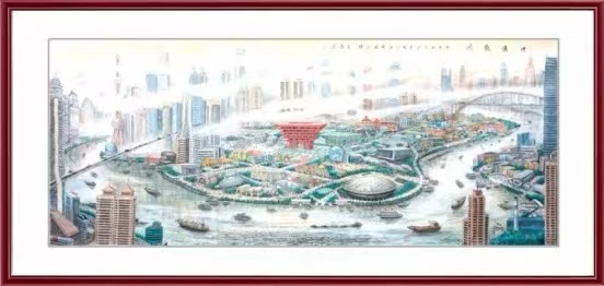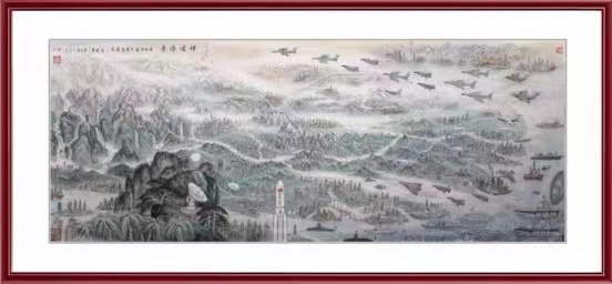 在画中,这幅画广采博取、意境深邃,不但画出了中国地大物博、疆域辽阔的地貌的特征,而且把中国的飞机、军舰、大中城市设施都集中展现在一幅画中,这是中外绘画史上绝无仅有的。这样的鸿篇巨制没有大胆的想象构思和创新,没有广阔的胸怀,娴熟的创作技能,没有关心国家各种事业发展的爱国情怀,是创作不出来的。