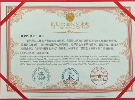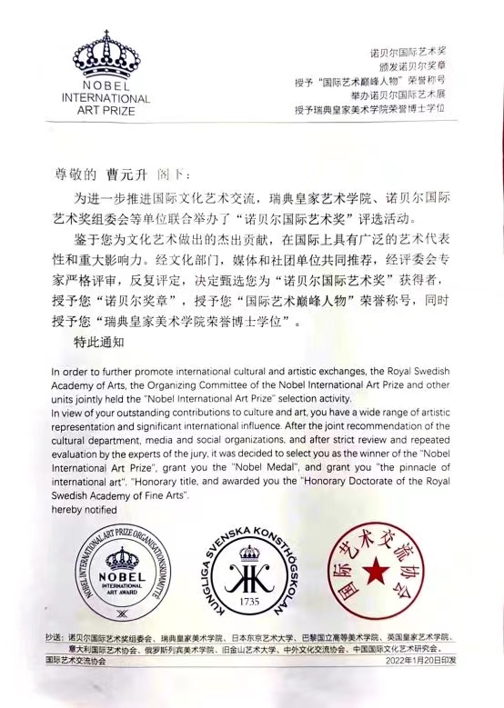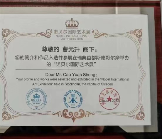 他创作的以习总工作历程为题材的《光辉历程》,创作的以习总提出的实现伟大民族复兴 的中国梦《巨龙腾飞》被 CCTV 电视台等多家报刊、媒体发表报道,引起社会高度关注。2017 年又被载人《中华人民共和国年鉴》(2017 年卷)。同时他创作的《云山红遍》等多幅美术, 书法作品被人民大会堂,国家画院及台湾地区前领导人马英九,连战收藏。 2022 年在诺贝尔国际艺术奖组委会、瑞典皇家美学院、国际艺术交流协会、巴黎国立高等美术学院、意大国际艺术协会、俄罗斯列宾美术学院、英国皇家艺术学院多个国际组织特举办得“诺贝尔国际艺术奖”评选活动中曹元升荣获“诺贝尔国际艺术奖”并授予诺尔奖章。