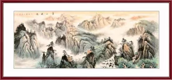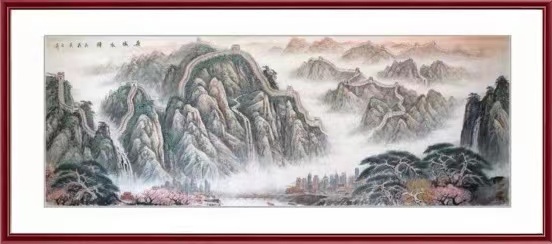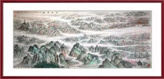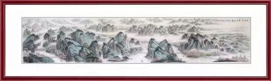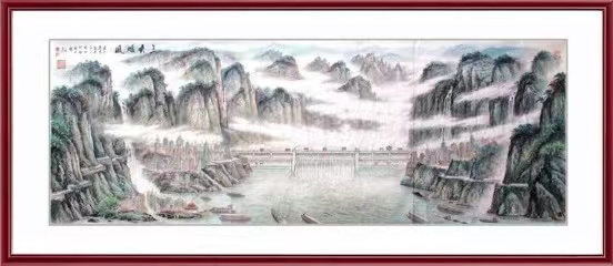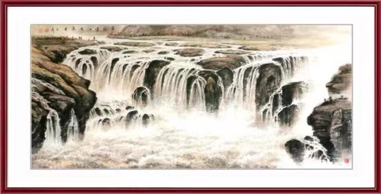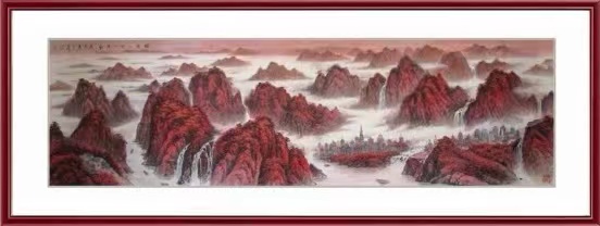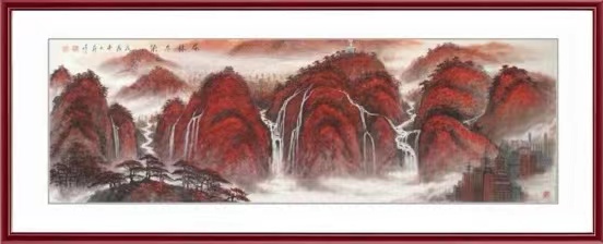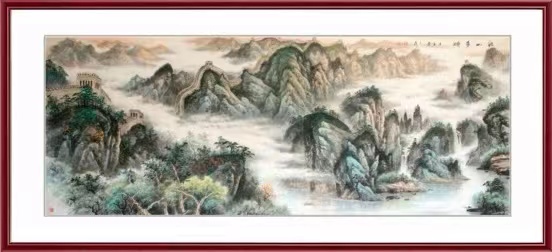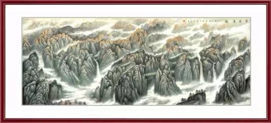 这幅画虽然内涵丰富、意境深远、山重水复,但繁而不乱、薄而不浮、浓而不板、散而不花、布局合理、疏密适当、清秀巍峨、壮丽辉煌。这幅画虽是一副气势恢宏的国画山水,但这幅画把国画、油