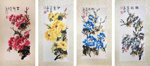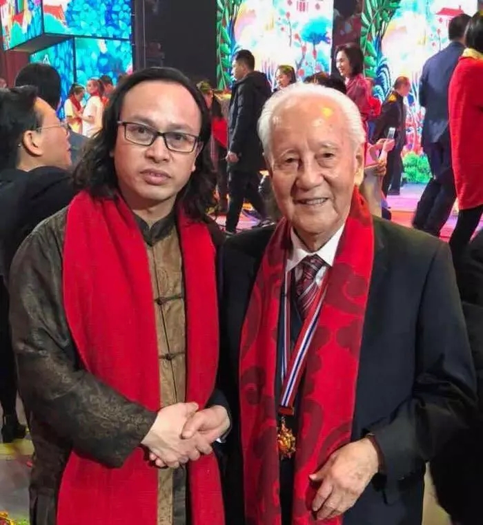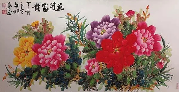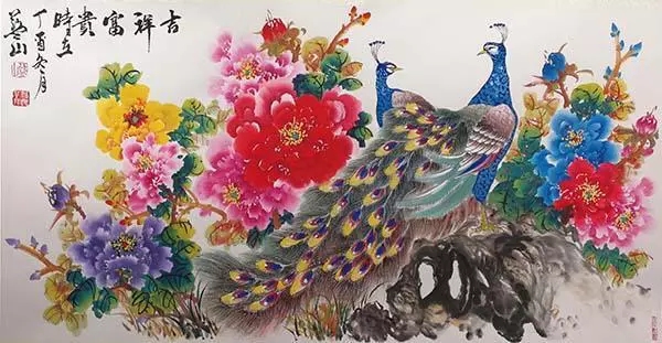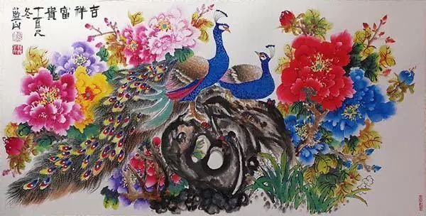 春晚《难忘今宵》演唱嘉宾、青年歌唱家汤非与国礼艺术家白一琅合影并收藏作品《花开富贵》
