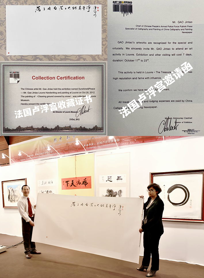 高津滔大师的艺术作品《落了片白茫茫大地真干净》被法国卢浮宫展出并收藏。卢浮宫博物馆艺术总监密莉安.阿诺妮女士和高津滔以及被卢浮宫收藏艺术品《落了片白茫茫大地真干净》在一起合影留念。