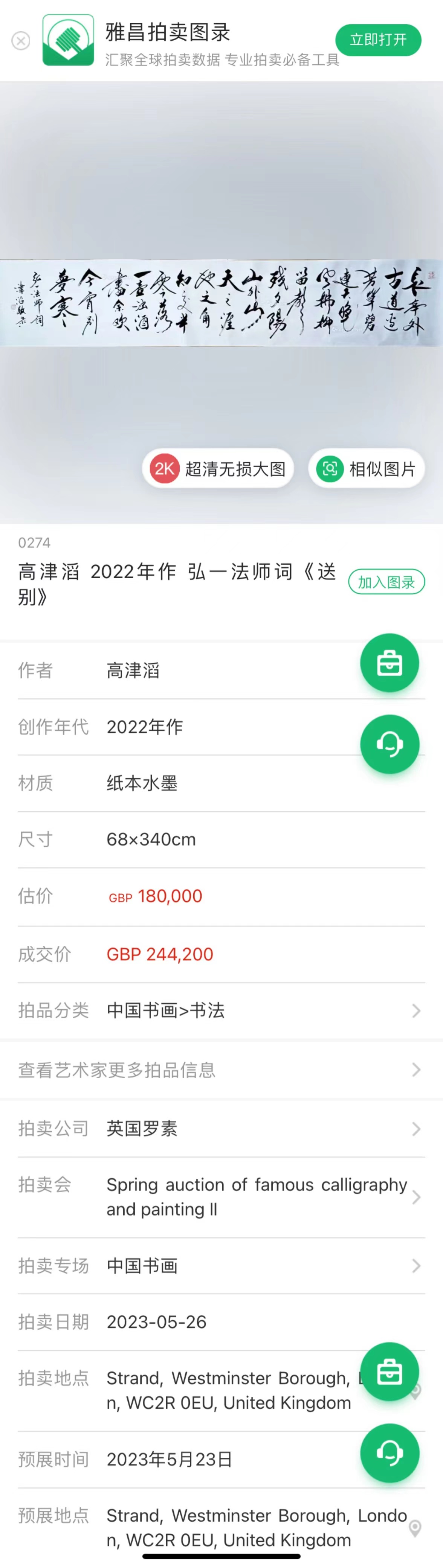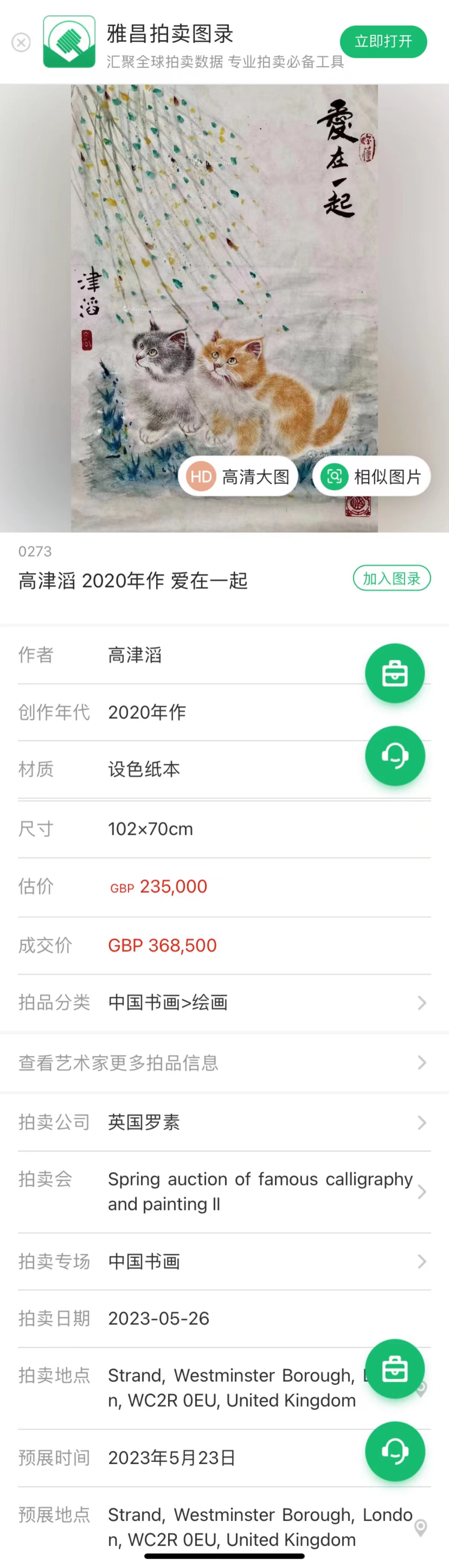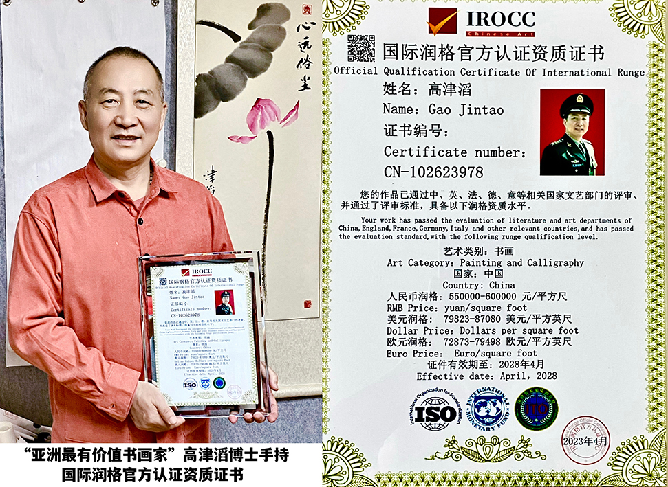 国际当代著名艺术家高津滔的艺术作品,被世界唯一一家经 ITO 国际贸易组织联合会批准成立的专业估价评估机构——国际润格官方认证中心,通过了中、英、法、德、意等相关国家文化艺术部门的评审,通过了评审标准,已获作品国际润格官方认证资质证书,有了具体的人民币、美元、欧元的价格认定。