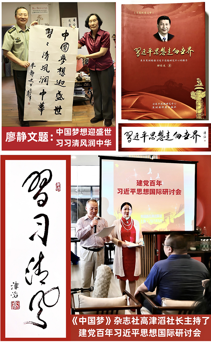 《中国梦》杂志社高津滔社长是习近平思想研究中心的组织者与联络人,致力于学习,研究、传播、贯彻、落实习近平新时代中国特色社会主义思想。高社长书写的“习习清风”系列作品不仅在北京、山东、广东、湖北、河北等国内多地展出,受到欢迎,而且在巴黎卢浮宫、在联合国总部展出,都受到好评。“习习清风”系列作品反映了习近平主席治国理政的成功现实,书写了人民群众对以习近平同志为总书记的党中央的高度肯定和认同。“习习清风”为什么能吹进卢浮宫?徐悲鸿夫人廖静文说:用书画艺术致力于歌颂习近平时代,描绘中国人的魂,传播中国梦、世界梦,引导人们沐浴心灵的阳光,享受生活的味道。这样,才能站在时代的制高点上,和一般的书画家区别开来。