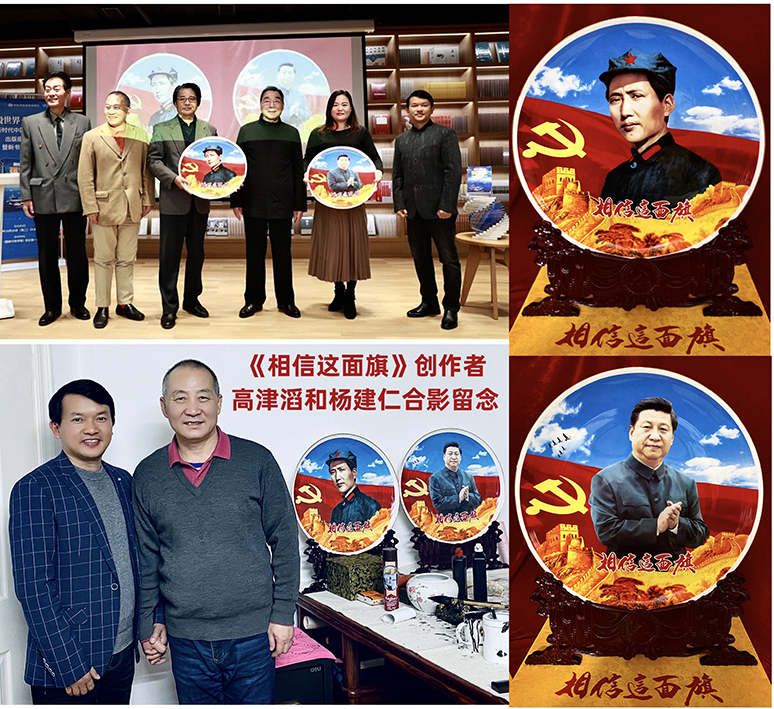 在党的十八大后,高津滔创作了《相信这面旗》系列歌曲,在中央电视台音乐台进行了制作和播放,在此基础上高津滔和杨建仁两位艺术家有感而发,两人通力合作,经过细心策划、精心设计研究、反复修改、成功烧造出《相信这面旗》两款领袖精美瓷盘。2019年10月,《相信这面旗》习主席精美瓷盘,国防大学教授刘明福作为国礼赠送给了日本前首相安倍晋三。《相信这面旗》两款领袖精美瓷盘,有的作为国家一带一路的礼品赠送给了各国大使馆,外国元首、国际友人等等;有的还赠送给了各机关单位、党政机构以及伟大领袖毛主席亲属等等,同时还被多家博物馆收藏。《相信这面旗》两款领䄂精美瓷盘,在《中华英才》等杂志媒体均有宣传报道。《相信这面旗》就是让广大党员和人民群众相信中国共产党,让世界人民相信中国。