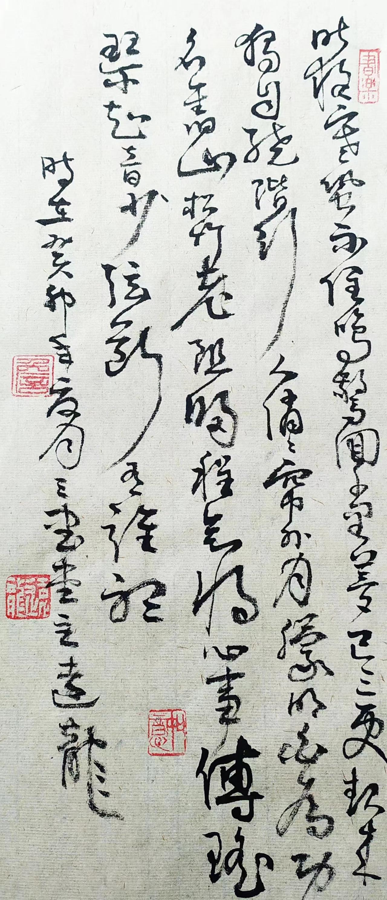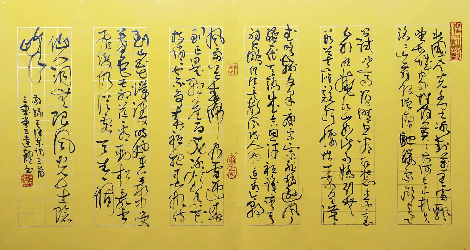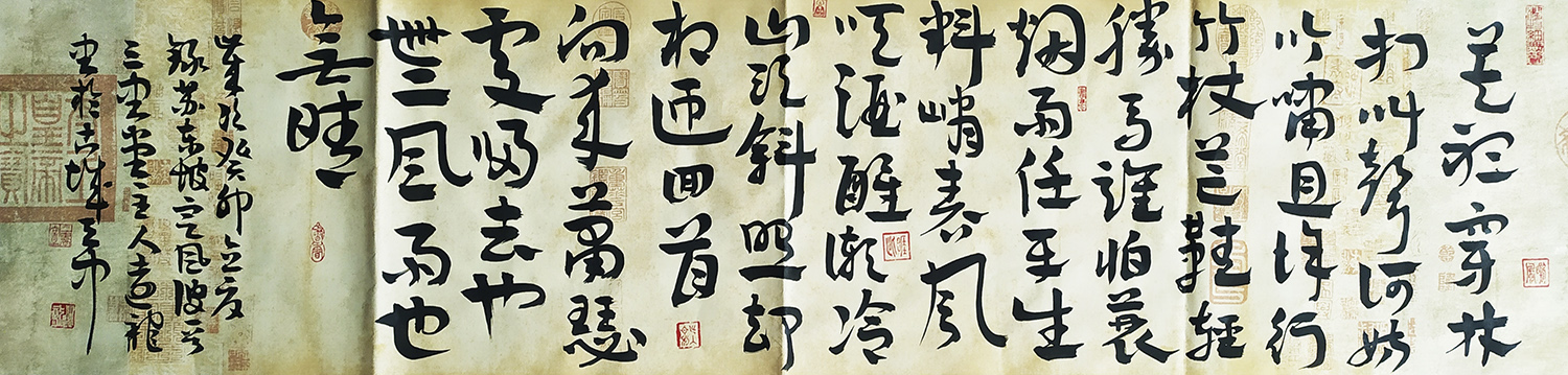 继观其行草众幅,作中一笔一划亦是皆是神采所彰显!行书取法以二王为根基,但却又不为其所拘泥,而是能在此基础上兼容自家情怀,使之用笔可以在刚柔相济中见俊秀,更可以在字势畅神中抒风范!而在草书作品中,詹远龙先生则又是能向我们展现出一股癫张狂素般的纵意气概,草书用笔使转自如,用墨浓时凝练有力,用墨淡时飞白洒脱,顿挫如高峰之坠石,回转如龙蛇之竞走,如此奇绝的笔线变化,观之真可谓是大家手笔也!手与神运,精神乃出!