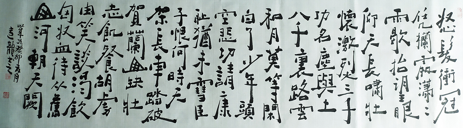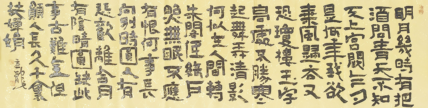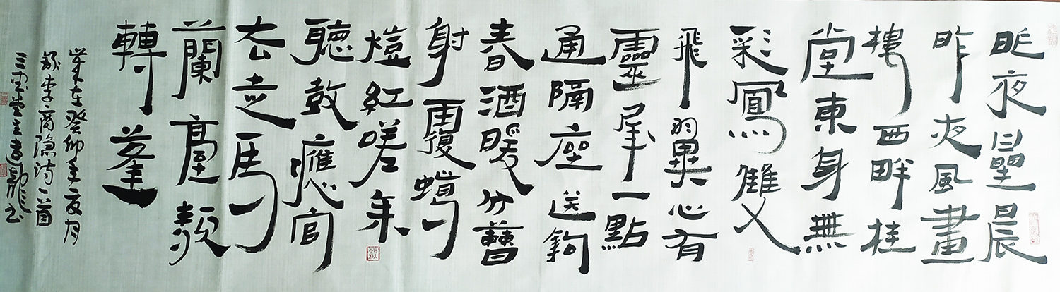 首观詹远龙先生的隶书作品,其隶书是有着很明显的汉隶基础和魏碑风骨,而对于各种碑法的临摹和汲取,他也同样是有达到了一种极其全面的境地。臂如一幅隶书之中,是可见曹全碑法的舒展之势,还有张迁碑法的古朴淳厚,亦是有中岳嵩高灵庙碑法的清超遒劲!点画之间,时而雄强如壮士拔剑,时而方整如铁画银钩,笔锋落墨,逆入出峰,致使方圆之际可见古朴典雅,多姿之时更见峻整遒健,浑穆之意,独树一帜!