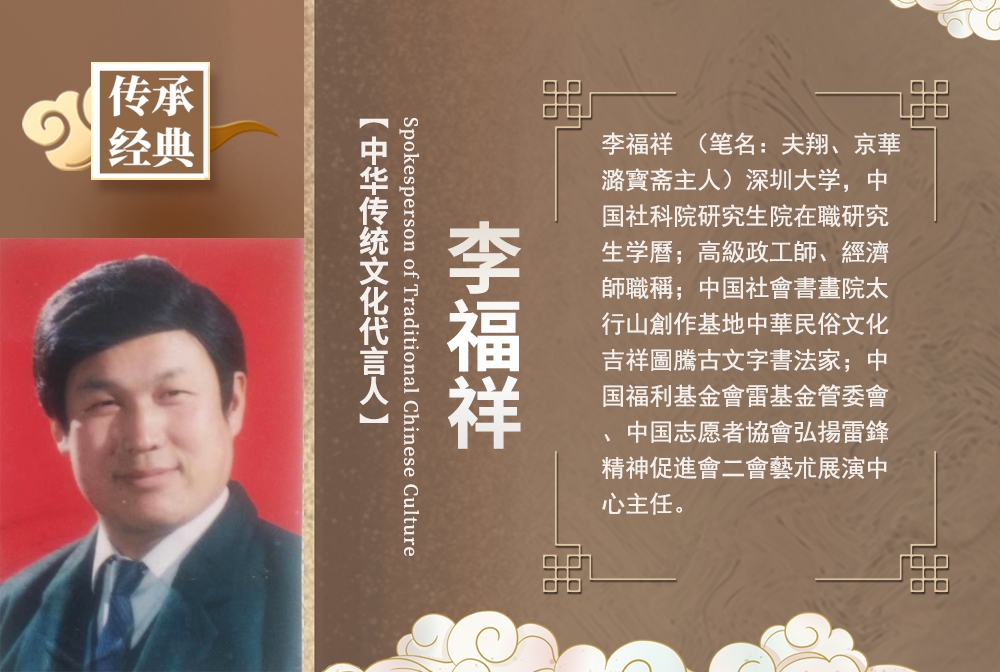 李福祥 (笔名:夫翔、京華潞寳斋主人)深圳大学,中国社科院研究生院在職研究生学曆;高級政工師、經濟師職稱;中国社會書畫院太行山創作基地中華民俗文化吉祥圖騰古文字書法家;中国福利基金會雷基金管委會、中国志愿者協會弘揚雷鋒精神促進會二會藝朮展演中心主任;雷鋒网特聘研究員;中国国際新聞雜志社編輯主任;中国民生调查网编辑主任;北京京視网手机臺、文化科技頻道《太行火种》欄目主編;太行老兵红色文化研究会(筹委会)主任。