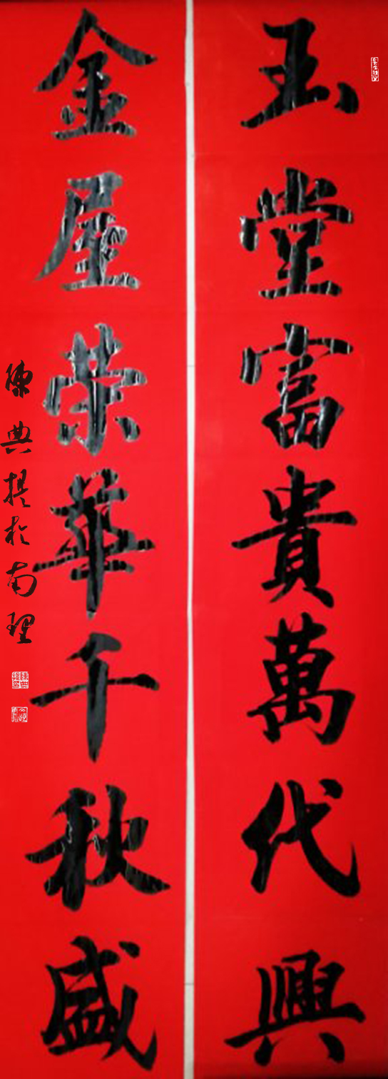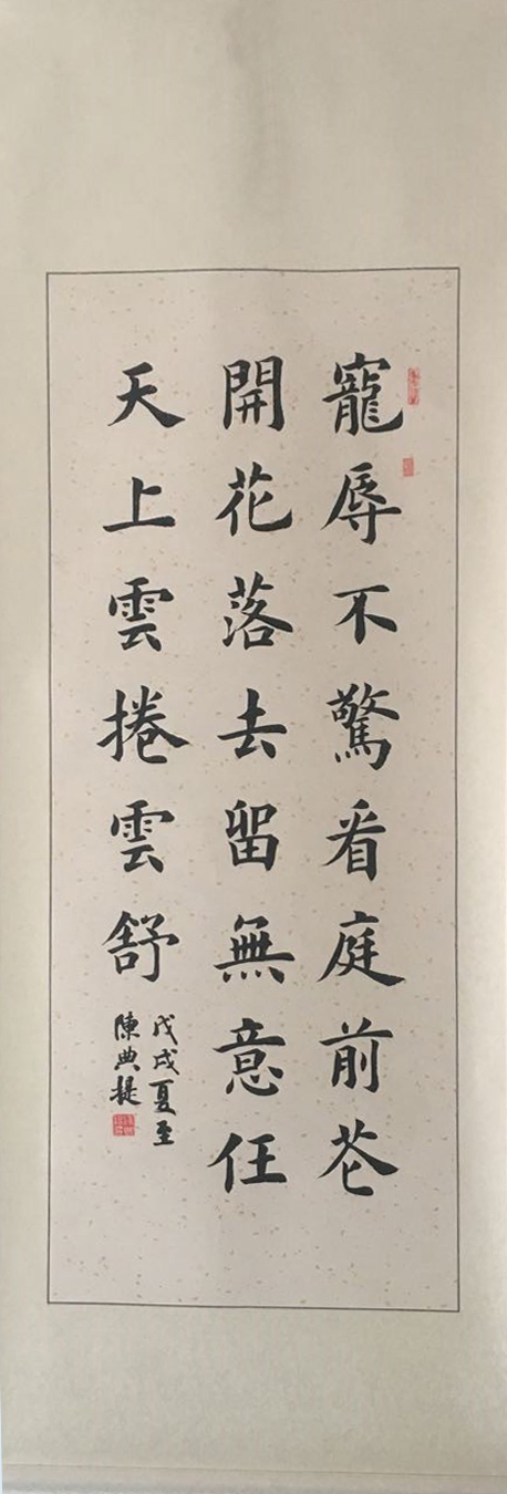 继观陈典提先生的楷书,其楷法之深,初观即可让人由衷折服!一幅楷作,可承先贤之端正,是有颜体楷法之正美,亦是有柳体楷法之风骨,此实谓尽皆精到矣。用笔力透纸背而无虚浮之痕,落墨厚重凝练而无刻板之意,点画妍美可见险绝,构字正大可察章法,纵览之余,无不是丰筋多力,书风畅神也!而依此功所书楷法,自然也就是能成为可观古典的标杆之作!心正笔正,可敬可佩!