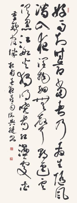 在行草书法作品的创作上,陈典提先生显然是有着一种纵意而为的豪迈情结,而这种纵意情结,也恰恰就是有和唐代名家张怀灌所言同源,即是其有一点一画,意态纵横,偃亚中间,绰有馀裕,结字峻秀,类于生动,幽若深远,焕若神明,以不测为量者,书之妙也!故而观其行草孩子总,是可见风骨之洞达,更是可感气势之超然,用笔用墨,皆以二王法度为根基,但却又丝毫不失癫张狂素的性情挥毫,米芾之意态,更是参悟至极!笔墨写得牵丝映带,捺画时如崩浪惊雷,时如壮士拔剑,横折时如劲弩筋节,时如龙蛇竞走,笔笔张弛有度,字字跌宕苍润,如此一幅所书,真是能在一点之内殊衄挫于毫芒,一画之间变起伏于锋杪也!