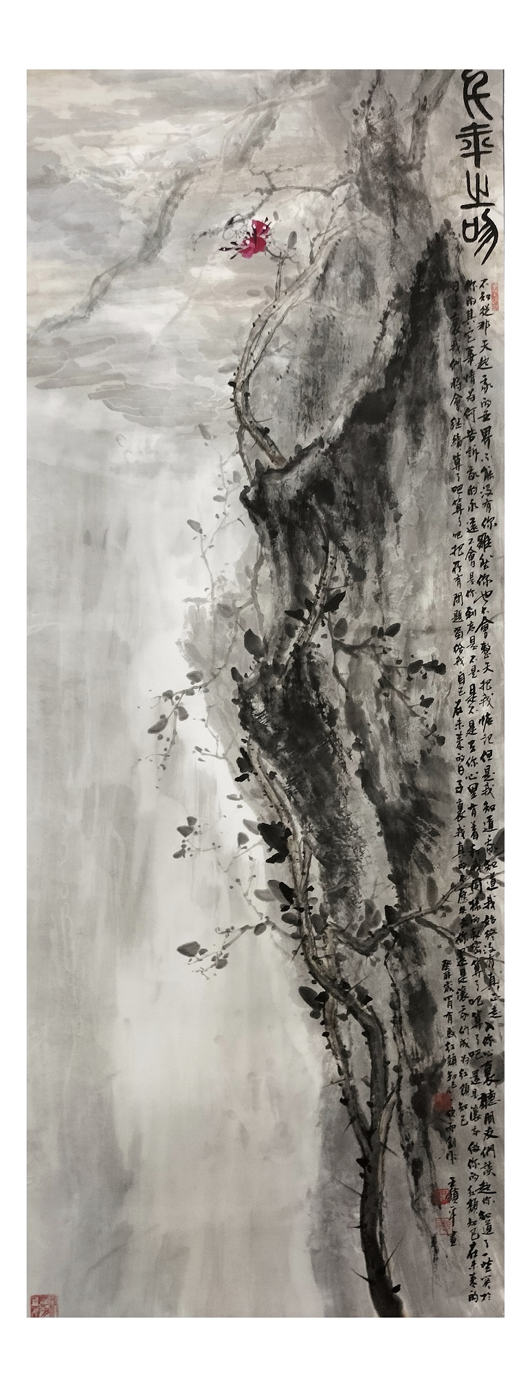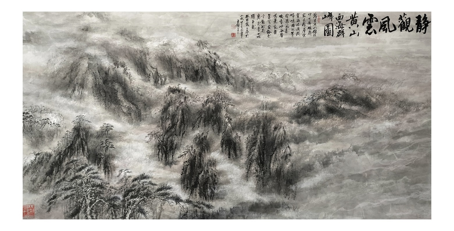 山水画承载着很多的传统文化精神,王维禅画山水,范宽以山水立骨传神,沈周依山水澄怀观道,石涛曰山水时有论笔墨当随时代。锁平先生创作山水,像写书法一样深深因循山水里的文化龙脉,带着为天地张目的精气神对境造意,也是通过山水创作独与天地精神往来的丹青贤家!他作山水,深谙六法之论,完全是一派笔墨精彩的孤标尘外!请看《盤江印象图》这一件惟妙的山水佳作,执笔作线,骨法峥嵘,勾下一笔滑畅劲健,复作勒笔钢打铁铸。这正是骨法用笔的精湛,把中国画依线条造型的本质表现得无以复加!无有一根线条凌乱,不让一笔失控而成为散兵游勇!又有诸多皴法的灵活调度,可以让笔法呈现千变万化,斧劈皴雄奇,折带皴错落,雨点皴空蒙,披麻皴生机。好的笔法就是其山水作品专业品质高能,让人无可挑剔的重要原因。