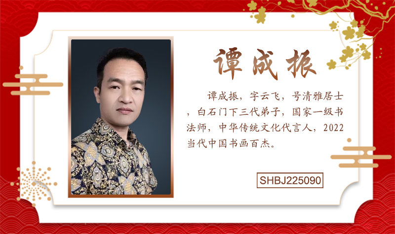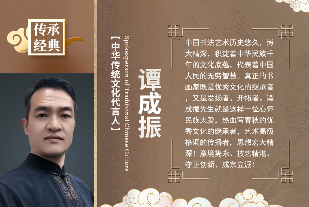 中国书法艺术历史悠久,博大精深,积淀着中华民族千年的文化底蕴,代表着中国人民的无穷智慧。浓黑的水墨在宣纸上书写的是中国千百年来亘古不变的文化诉求。真正的书画家既是优秀文化的继承者,又是发扬者、开拓者。谭成振先生就是这样一位心怀民族大爱,热血写春秋的优秀文化的继承者,艺术高级格调的传播者,思想宏大精深!意境隽永、技艺精湛、守正创新、成宗立派!