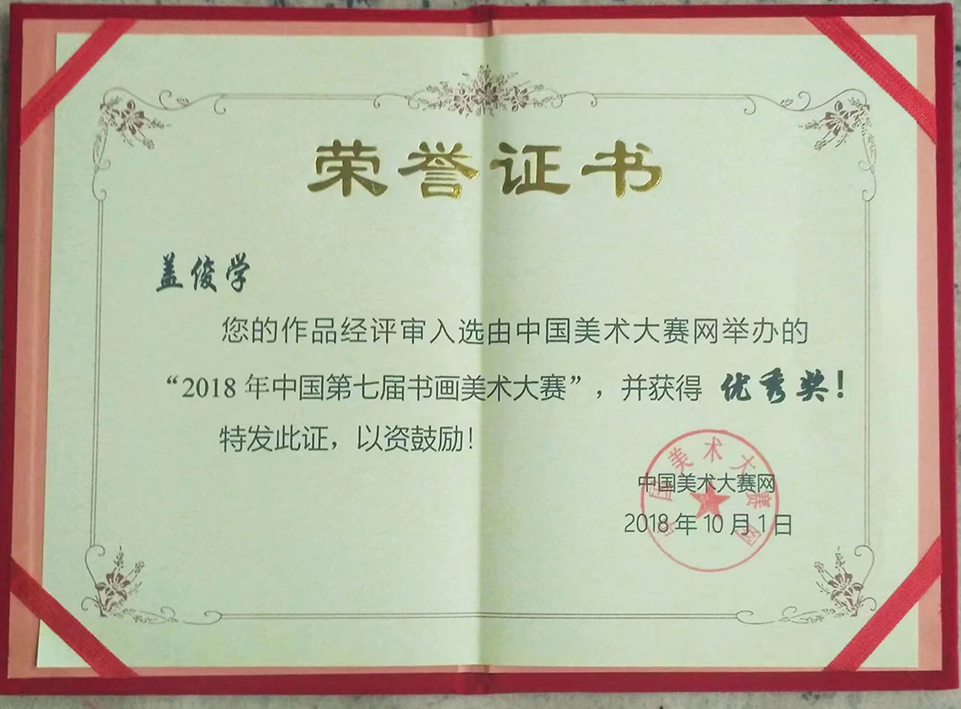 盖俊学,字盖之。八十年代末考入中国书画函授大学,师从沙孟海先生,后加入烟台市书法家协会,18年参加第七届中国书法美术大赛,获优秀奖并加入山东省书协至今。中国优秀艺术家。