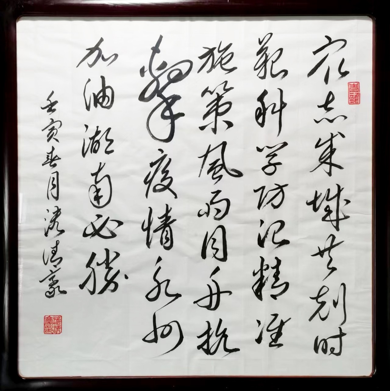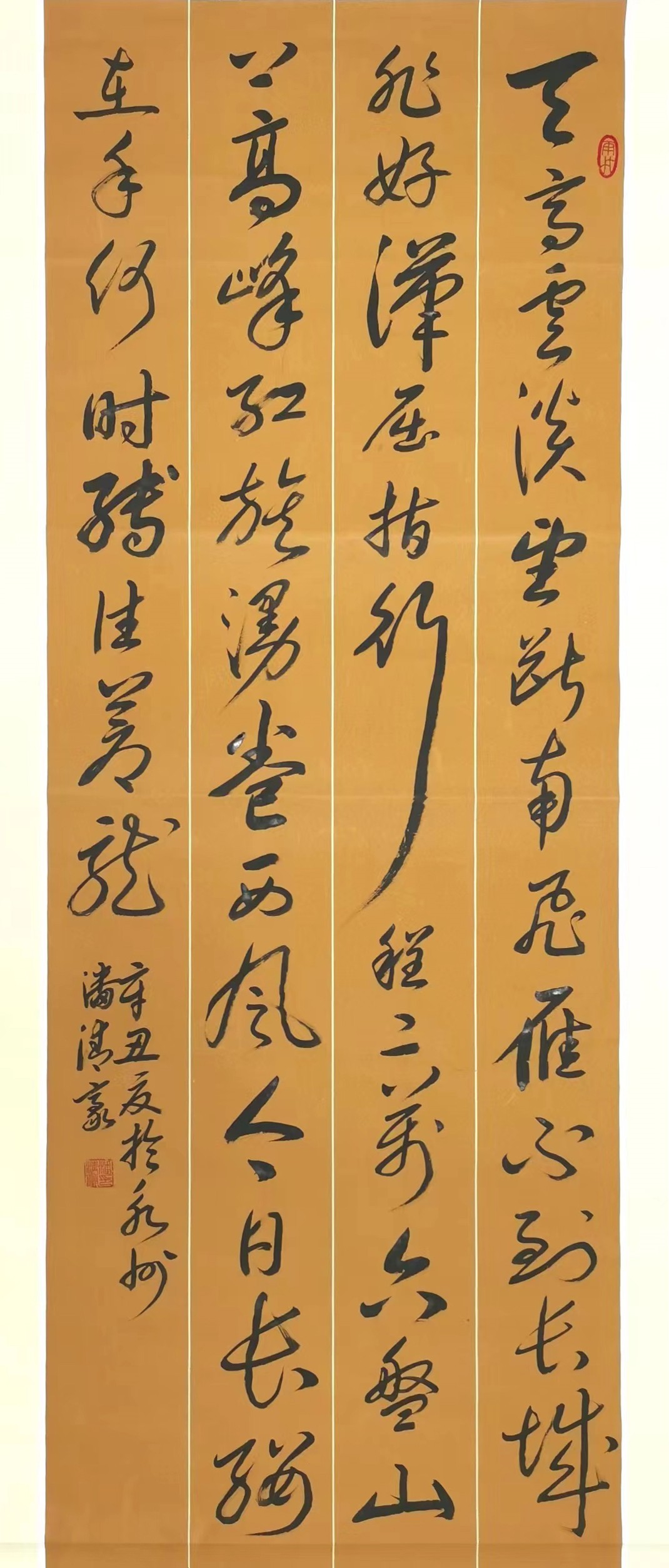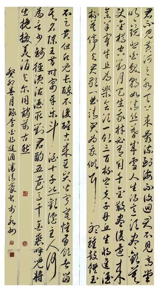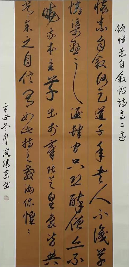 潘清豪同志从师何维力、陈松柏、王岐云。初学欧阳询,后学赵孟頫,兼学“二王”、苏轼、米芾、黄庭坚、孙过庭、褚遂良、唐寅、启功等,在学书中曾得中国书法家协会副主席毛国典、胡紫桂、崔向君、崔国强等大师们指点。在博采约取中,对书法反复参悟、兼容并蓄,渐次形成了自己独特的笔墨语言,他为人忠厚、侍人热情、不做作、不浮夸。他的书法作品,因其独特的经历,造就了他独特的艺术,其作品接地气具有浓厚的乡土味、具有军人的刚脆果敢、具有财政的谨慎婉转、具有公务员的宽广包容。独具一帜具有鲜明的个性。其作品信手涂抹,观之若脱缰野马,乘空而来、绝尘而去;又如蛟龙飞天,流转腾挪、来自空无,又归于虚旷,近乎癫狂原始生命力的冲动包孕天地乾坤的灵气。书法里融入了儒家的坚毅、果敢和进取;也蕴涵了老庄的虚淡、散远和沉静闲适。还往往以一种不求丰富变化,在运笔中省去尘世浮华,以求空远、清幽的意味。其用笔:中锋为主、偏侧并用;以圆见多、方圆结合。点画精到、欹正相生,以形求势、心手合一。用墨:渴笔求润,湿如饱含春雨丰腴溢彩;枯如干裂秋风古藤老树。结字匀适飘逸,行草相间如行云流水、洒脱自然。章法:规矩调和、统一和谐;布白守黑、赏心悦目。所选作品:以条幅为主,中堂、斗方、对联、扇面。多形式巧手法,取其妙、去其俗,气韵生动、风格鲜明,具有中和之美,字里行间有真情实意。笔断意连气势相通。其色、其形、其浓淡枯湿、其连绵婉转、精细藏露,皆变化无穷、气象万千,笔势雄奇、姿态横生。或劲键婉约、或婀娜娉婷、或矫健勇猛、或春风拂面繁花一片、或北风入关深沉冷峻。他用书法弘扬民族文化精髓,演绎书法神奇魅力。其书清高,首重人品,品节既优,不但人人重其笔墨,更钦仰其人。