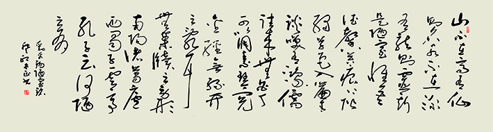 正大气象承唐法,磨砺碑帖传晋韵。书法的本质艺术属性是线条造型艺术,先生作书法,笔墨走性灵,线条师万物,把书法线条艺术的本质属性表现得无以复加。横如排云布阵,点若危峰坠石,每作牵丝映带,如虬龙蜿蜒,亦如鸾凤徘徊。所以看他的书法,无论是行草书都是用笔者天成的姿态要妙,道法自然!书法成书道,这就先生修炼翰墨取法为上,得法亦为上乘的见证。