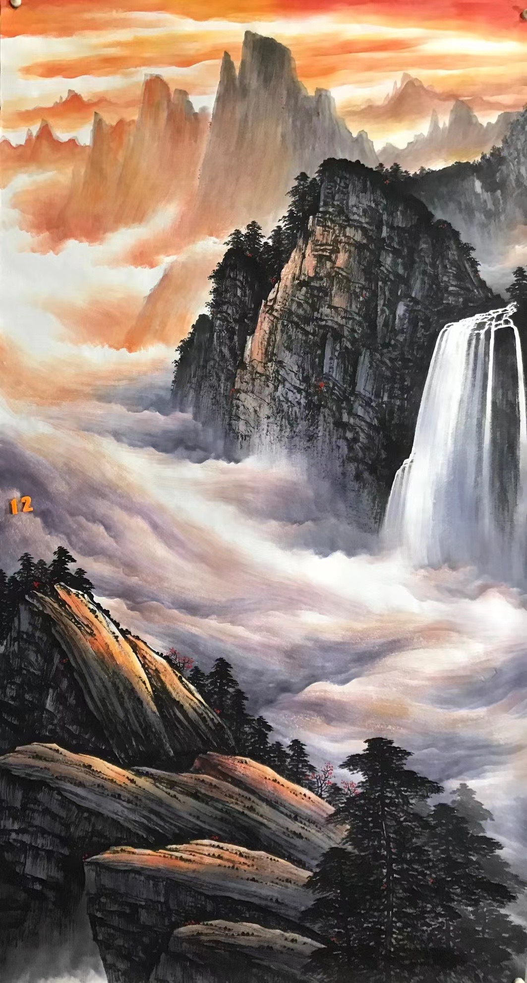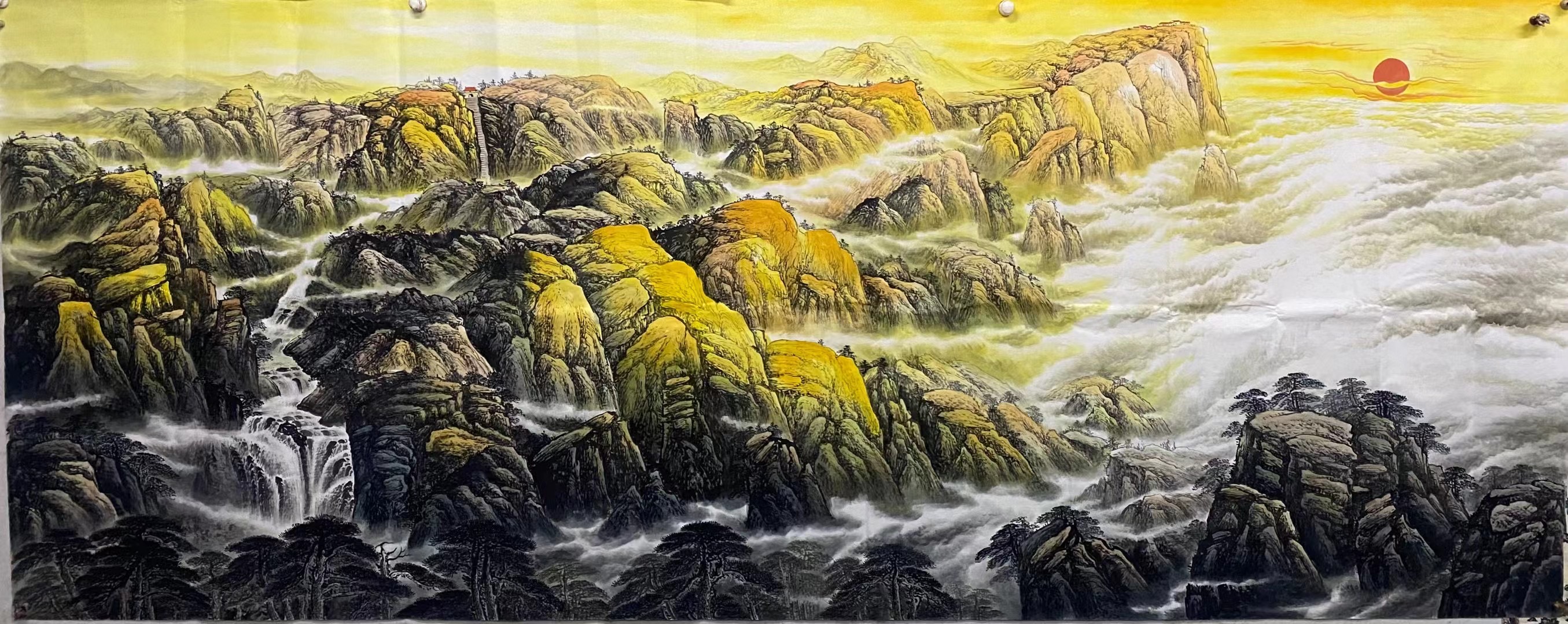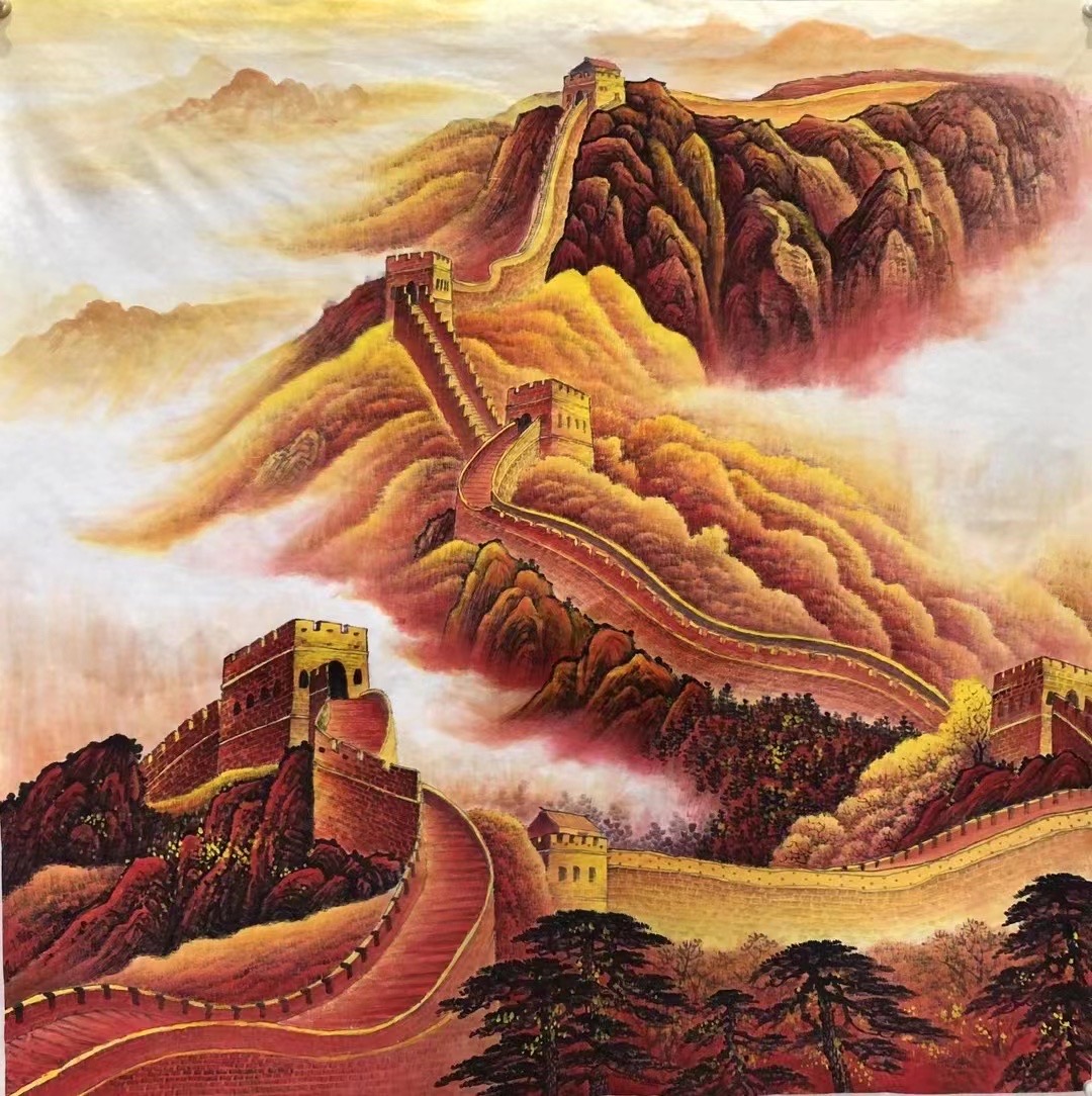 其笔下的《长城》霞光万道、云海缭绕,将砖瓦的细致、云雾完美的细致刻画在长城之间,画中所描绘的长城景色意境高远,绵延数万里,象征着河山永固,屹立于世界东方,画面布局错落有致,巧妙的处理了近景与远景之间的虚实关系,沧桑雄峻的城墙、苍茫恢宏的山峦,峻峭刚猛,绵延远去的长城气象万千,充分展示长城之壮美雄浑 透过画作仿似能够看到雄关漫道、故国情怀的氤氲之息,气势磅礴的万里长城图彰显了中华民族的民族精神和魂魄,以及大好河山的美丽景象,曲折蜿蜒连绵不绝的长城穿梭于云雾之中,漫天遍野的树木郁郁葱葱,一幅幅繁荣昌盛的景象,给人以无穷的视觉延伸感。