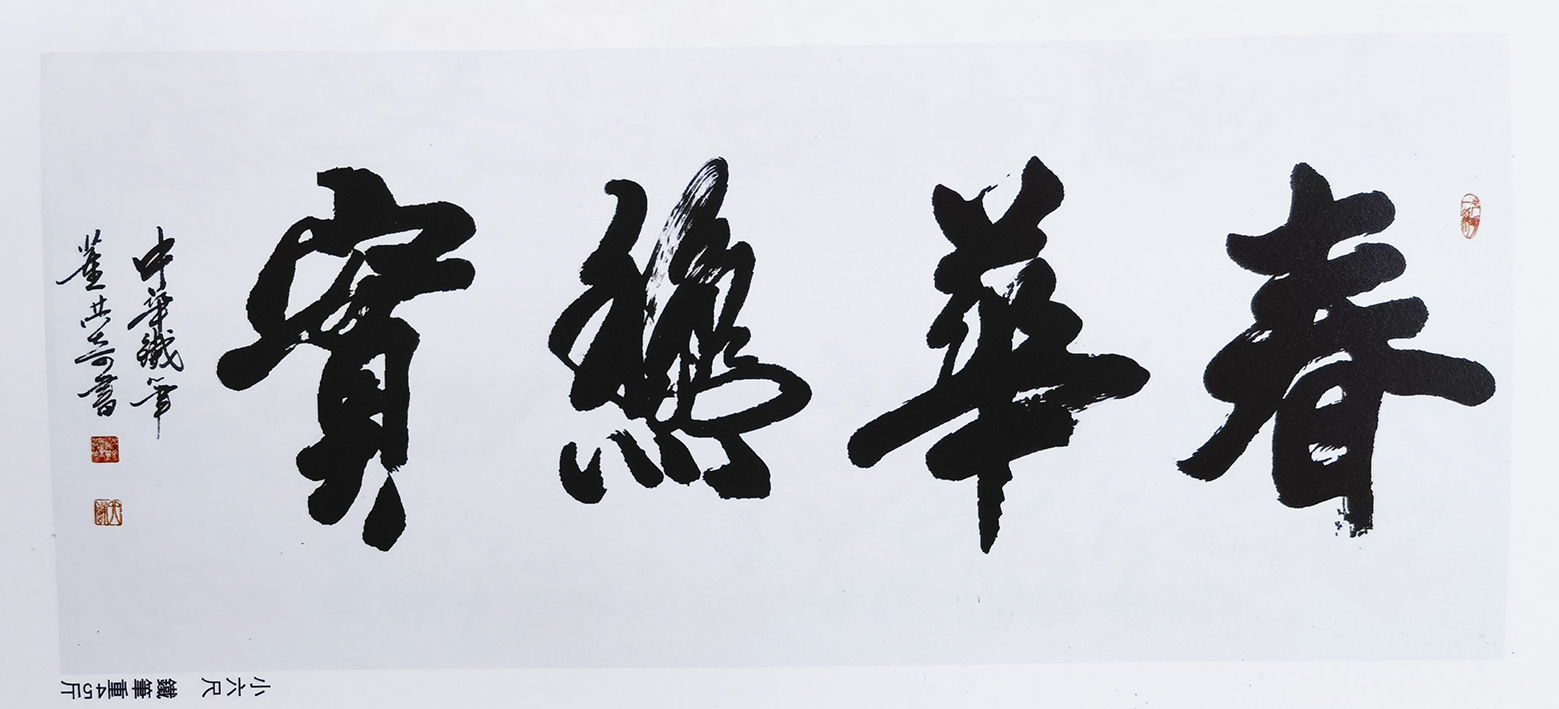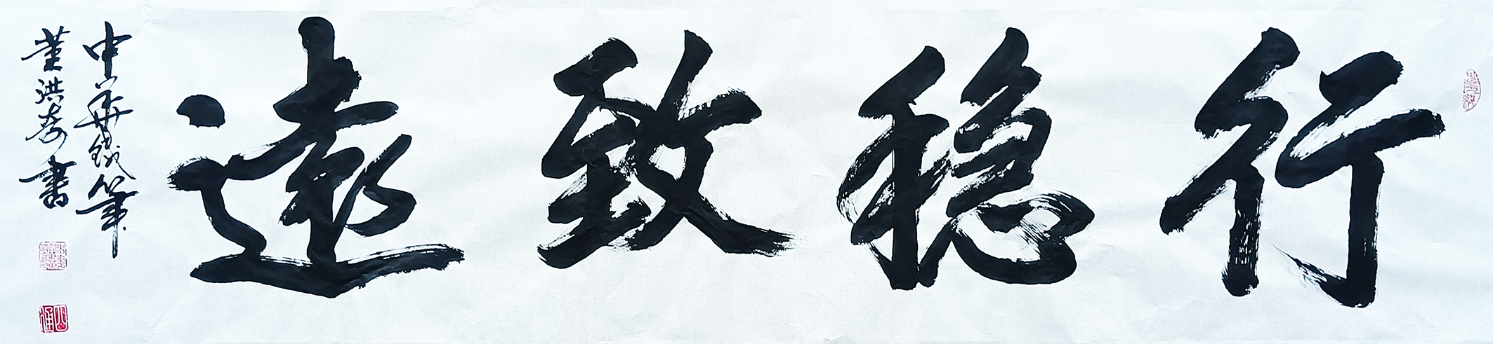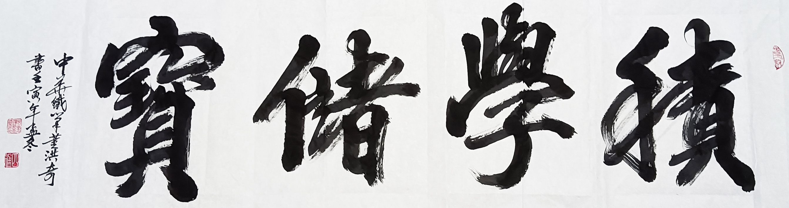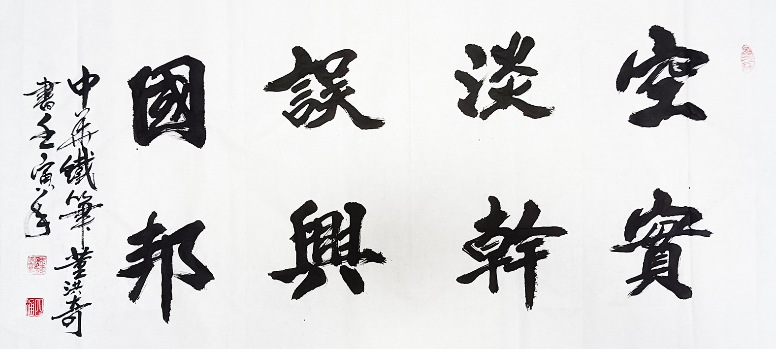 董洪奇先生所用的毛笔除了笔杆是铁制的之外,上端还加有一块块重量不等的如哑铃状的铁块。负重在0.5公斤至45公斤不等,观其书、数十斤的铁笔挥洒自如,样样洒洒,几十幅大字写下来笔不败,气不喘,右手笔走龙蛇,左手落款定终,令人惊叹。赏其字,奔放自如,大处着眼,小处入手,疏密有度,正侧起伏,大能腾云驾雾,小能钻缝越隙,隙母恋子,如油丝一片。笔墨气韵掌握的得心应手,笔不尽,墨不枯,不停笔,真正达到了艺术的高度境界。而小楷秀丽潇洒,风骨凛然,灵性自如,功底深厚,在魏碑上有所创新,虽师古而不泥古,自成一体,真正达到了炉火纯青的境界。