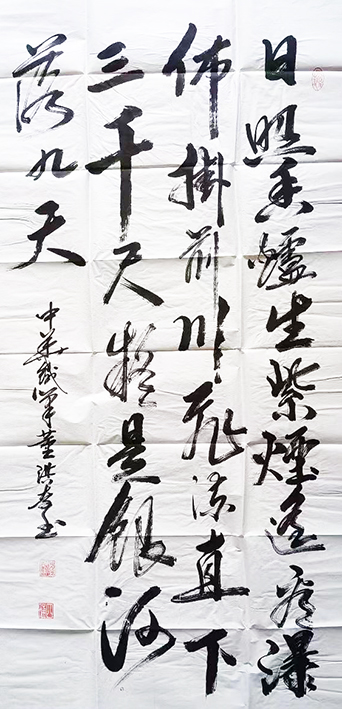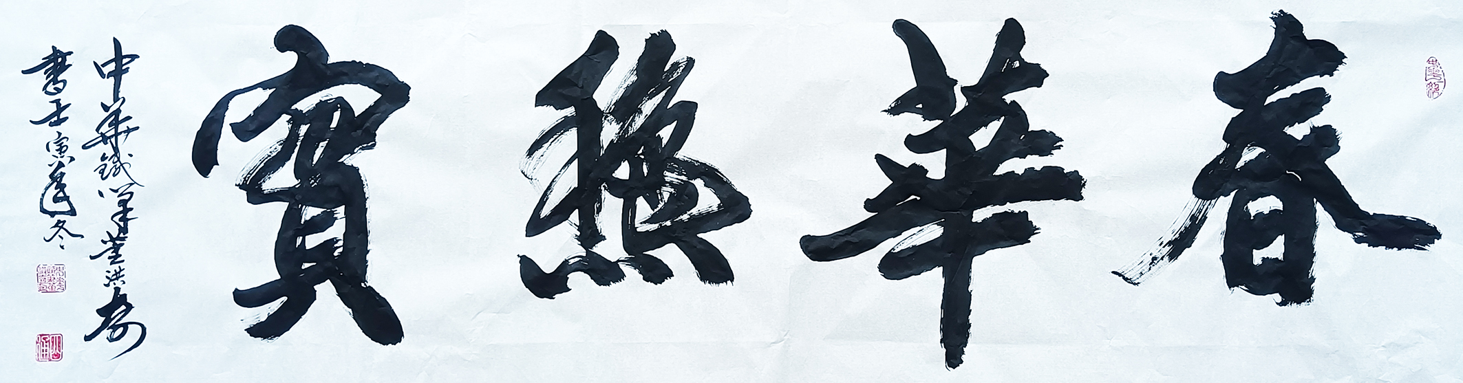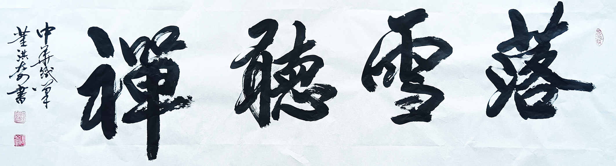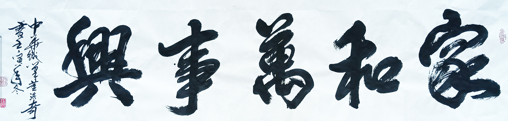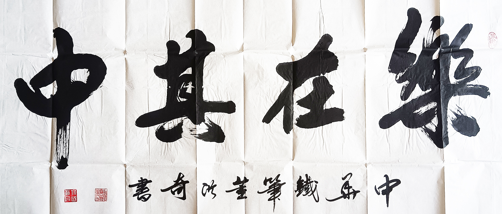 董洪奇先生所用的毛笔除了笔杆是铁制的之外,上端还加有一块块重量不等的如哑铃状的铁块。负重在0.5公斤至45公斤不等,观其书、数十斤的铁笔挥洒自如,样样洒洒,几十幅大字写下来笔不败,气不喘,右手笔走龙蛇,左手落款定终,令人惊叹。赏其字,奔放自如,大处着眼,小处入手,疏密有度,正侧起伏,大能腾云驾雾,小能钻缝越隙,隙母恋子,如油丝一片。笔墨气韵掌握的得心应手,笔不尽,墨不枯,不停笔,真正达到了艺术的高度境界。而小楷秀丽潇洒,风骨凛然,灵性自如,功底深厚,在魏碑上有所创新,虽师古而不泥古,自成一体,真正达到了炉火纯青的境界。