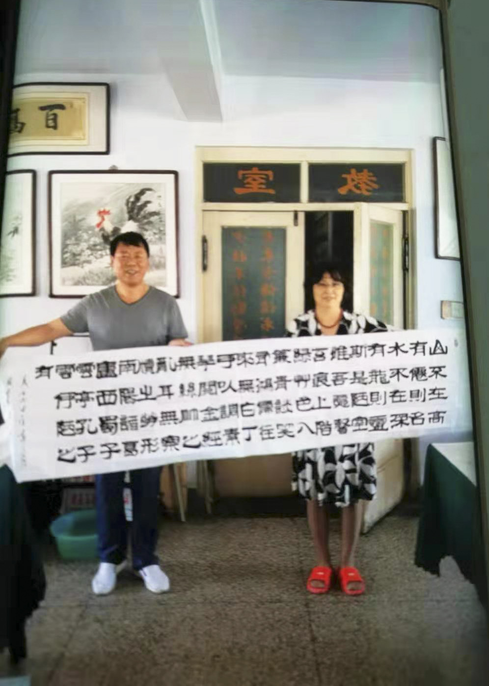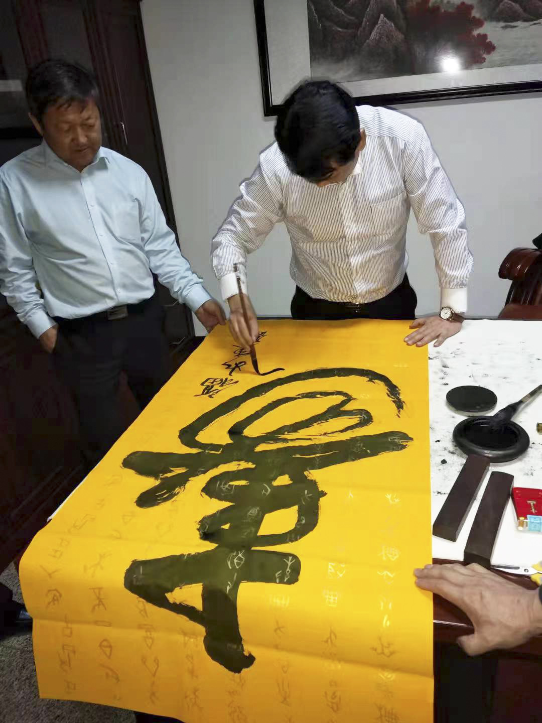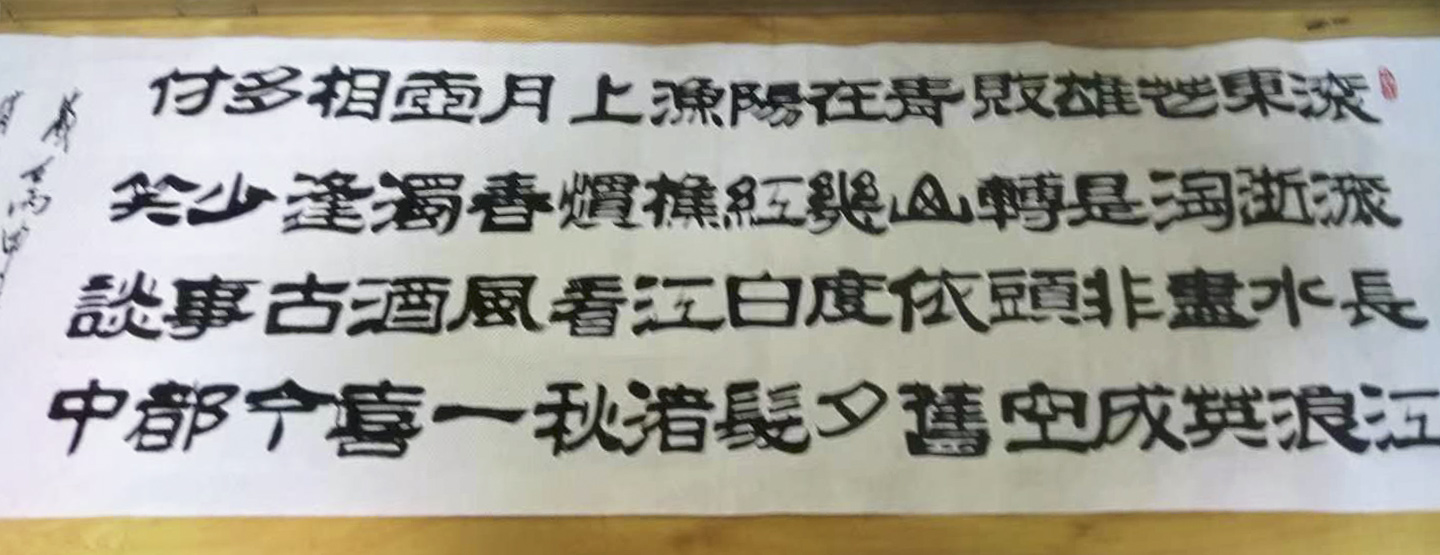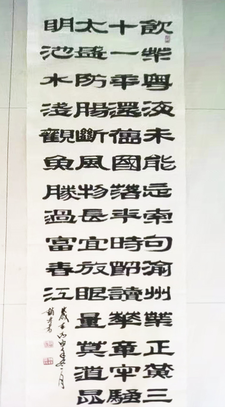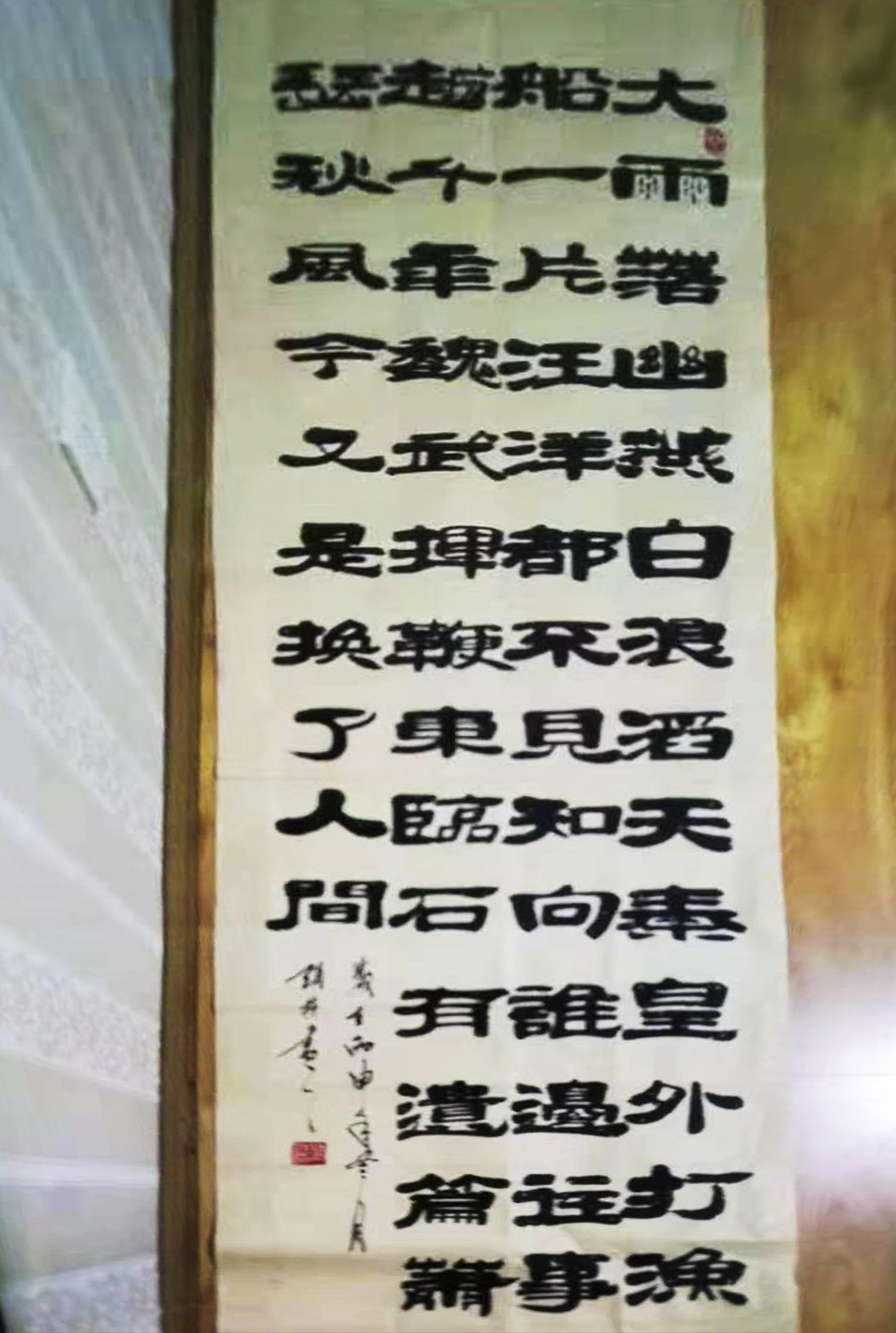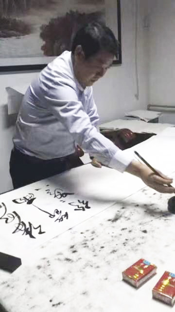 赵林先生的书法用笔洒脱,自然流畅,拙朴沉厚,作品的视觉效果非常突出。赵林先生从五岁开始练习书法,源于家庭的熏陶,祖父是满清的举人,对于书法,诗词等有着深厚的功力,并且把自己一生的积淀毫不吝惜的传授给了自己的后人。几十年后,赵林先生在商海中已经小有成就,但是,从没有间断过书法的练习,走进赵林先生的书房就能感觉到浓浓的墨香和文人的静雅,近两百平米的书房,墙壁上挂满了名家的字画,红木书柜中有各种藏书,红木展架上摆满了各种古玩,真是琳琅满目,古色古香。赵林先生的秦篆汉隶,风格厚朴无华,后来研习魏碑,更趋向于厚重感,笔者看到赵老师的一幅作品,毛泽东诗词《沁园春·雪》,满纸烟云,若历史长河湍然而至,奔腾不息,似万里江山气势磅礴,与原诗词内容相辅相成。书法的字迹标新立异,苍茫之气发于笔墨之间,给人以一种全新的审美意境。作品的墨色随用笔的变化而变化,给观赏者以视觉上的调节,使人感到笔墨被赋予了生命,生机盎然,达到了尽性尽理,璀璨夺目的艺术境地。