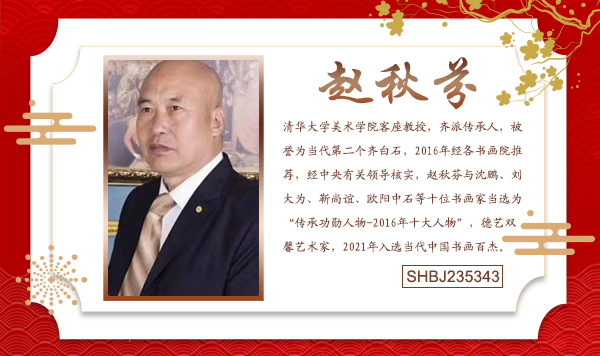 赵秋芬清华大学美术学院客座教授,齐派传承人,被誉为当代第二个齐白石,2016年经各书画院推荐,经中央有关领导核实,赵秋芬与沈鹏、刘大为、靳尚谊、欧阳中石等十位书画家当选为“传承功勋人物-2016年十大人物”,德艺双馨艺术家,2021年入选当代中国书画百杰。
