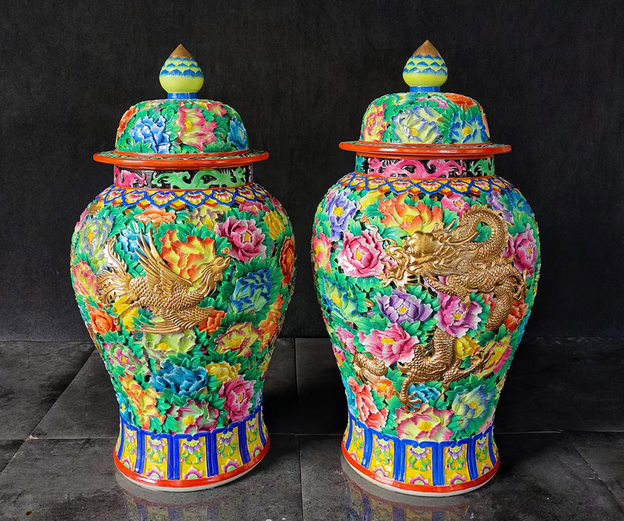 雕刻龙凤呈祥万花将军罐一对  (70cm*41cm×2)