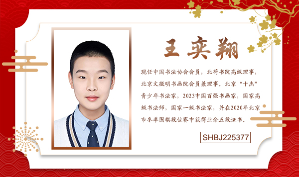 王奕翔,2009年出生于北京市。王奕翔深受祖辈艺术熏陶影响,自幼酷爱书法艺术,5岁开笔练字,在多年学艺习书过程中,沉醉墨池,潜心研究中国传统书法技艺和书法理论,先后临模颜真卿、栁公权、王羲之、褚遂良,魏碑诸帖等书法历代名家书帖数年。在继承传统书法的同时,融会贯通、思索创新,始终以孜孜不倦、不耻下问、勤奋好学的致学态度,广泛吸取营养、博采众长,从而融碑帖之所长,集诸体之风范,去粗取精,形成自家风貌。其作品主要以榜书和行书为主,问世以来,有魏碑雄健之底蕴,唐楷之遒劲与伟岸,格调雄伟中透者秀气,厚重中辅以奔放,有古朴之风而无泥古之造作。另还喜欢线描画,擅长于围棋、线描、水墨、爱好收藏石刻。