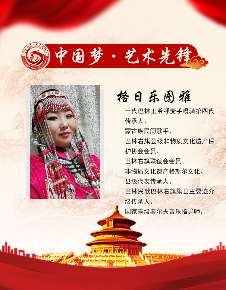 格日乐图雅、蒙古族、1979 年出生于内蒙古赤峰市巴林右旗巴彦尔登苏木十家子嘎查哈鲁队(现大板镇)普通牧民斯迪巴斯尔,萨仁高娃家。一代巴林王爷呼麦手嘎骑第四代传承人、蒙古族民间歌手、巴林右旗县级非物质文化遗产保护协会会员、巴林右旗联谊会会员、非物质文化遗产格斯尔文化、县级代表传承人、巴林民歌巴林右旗旗县主要迹介级传承人、国家高级奥尔夫音乐指导师。