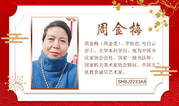 周金梅(周金美),字怡君,号白云居士。大学本科学历。现为中国书法家协会会员、国家一级书法师、国家机关美术家协会顾问、中国文化教育诚信艺术家、中国当代名家书画协会副秘书长、