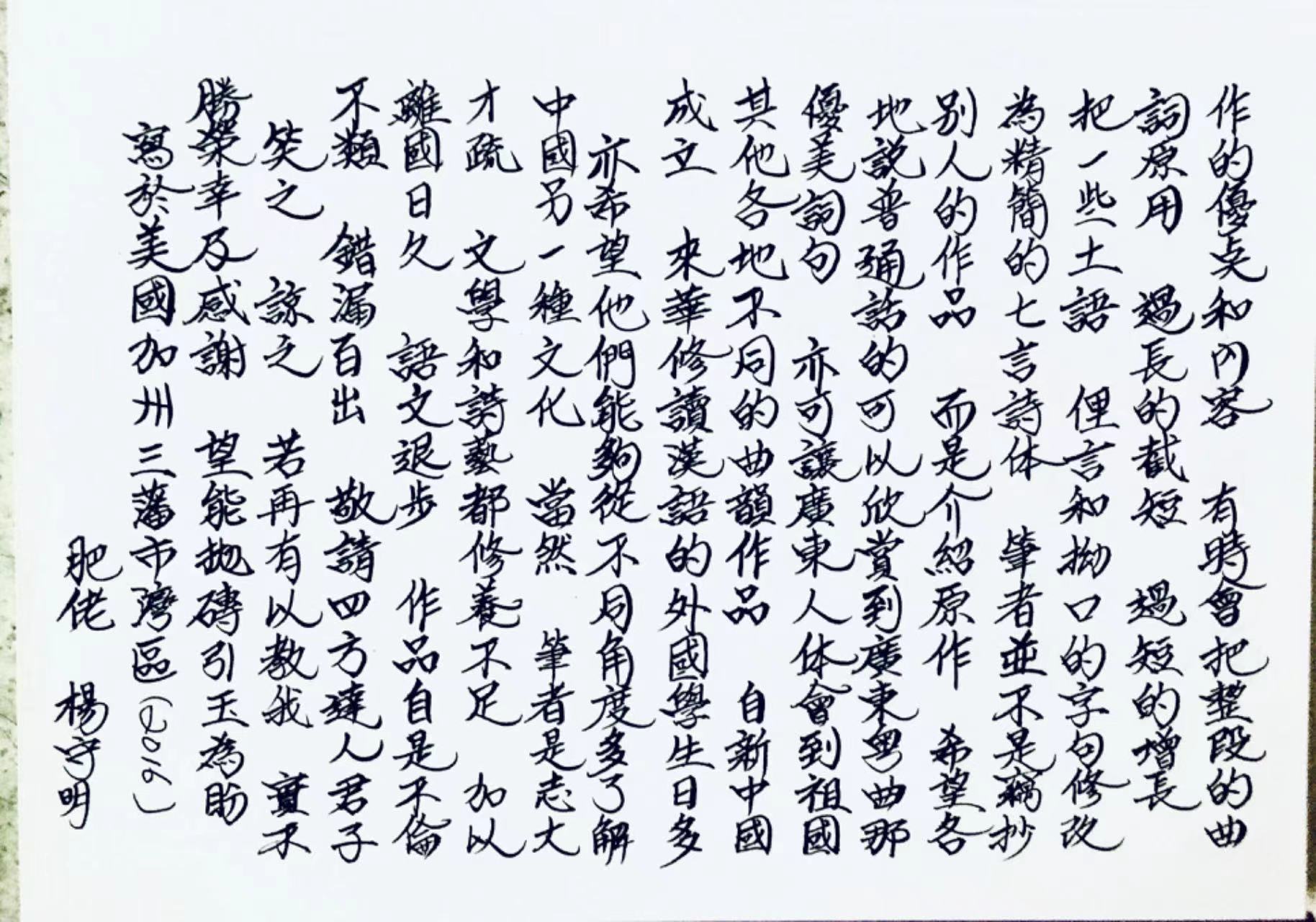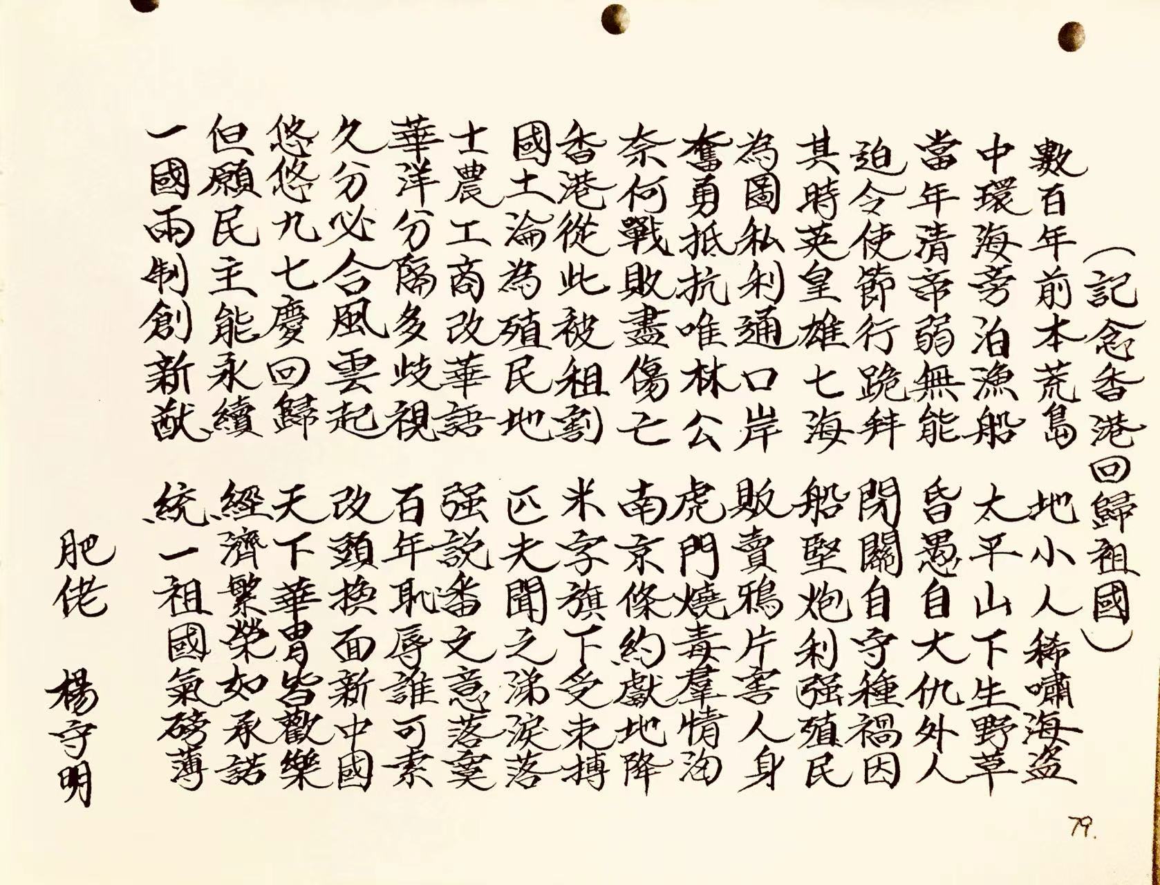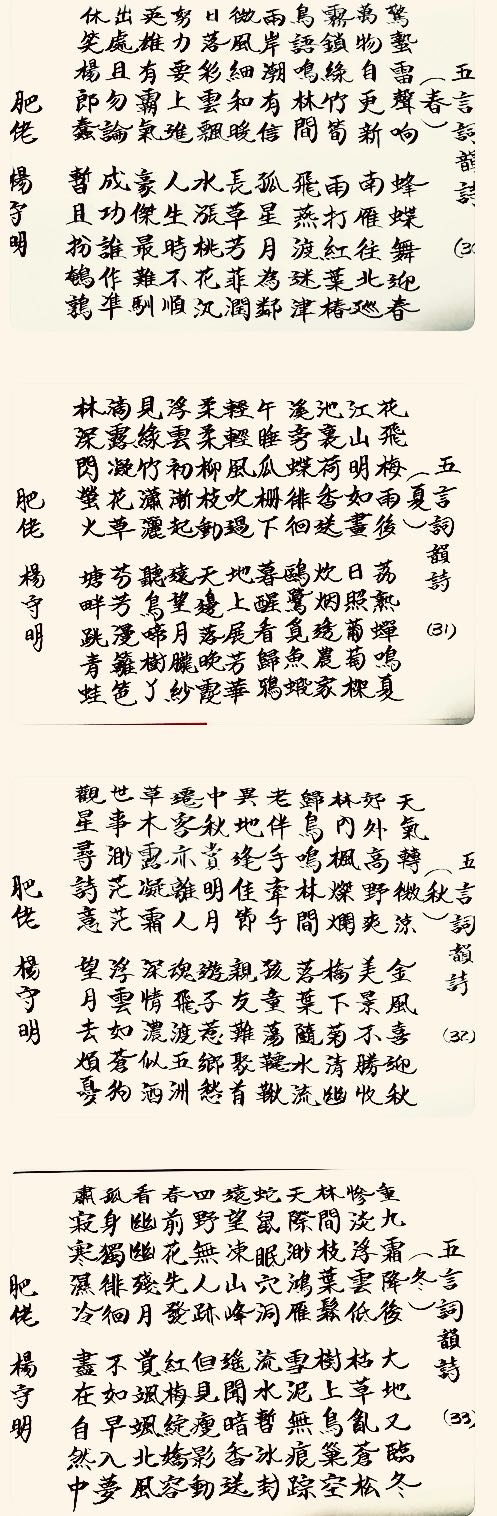 楊守明 別號肥佬 1952 生長於香港 1974 遠赴美國留學 畢業於美國德薩斯州亞霊頓州立大學 1978 得商科學士學位 1980 再得文科學士學位 曾經旅居美國44年 最近回歸 暫居香港 歴年曾經從事於 酒店 餐飲業 食品銷售及加工行業 進出口貿易 石油開採 地產 保險及證券經紀 晩年致力研究中國古典詩詞文學 戲曲和書法。作品有:1 亂題集 2 塗鴉集 3 香港話六聲譜 4 變聲水調歌頭詞集 5 變聲鷓鴣天詞隼 6 七言曲韻詩集 7 五言詞韻詩集 8 歴代帝王吟七言詩集…。