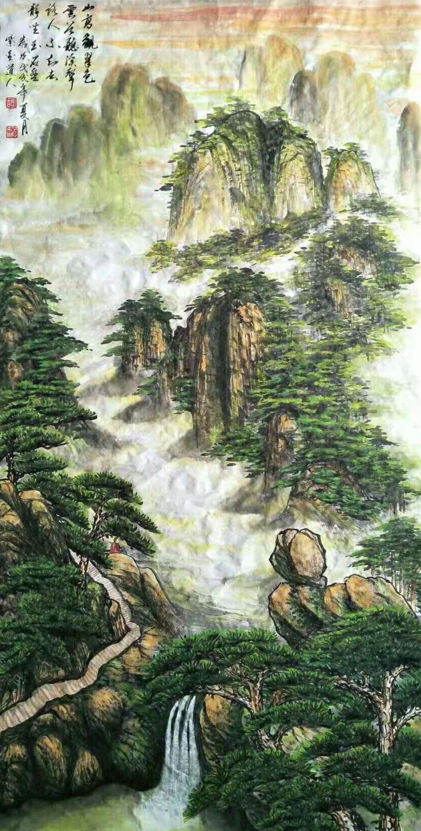 而在山水作品中,胡广成先生则又是能尽显一种恢弘旷达的博观之气,是谓胸中具上下千古之思,腕下具纵横万里之势也!施色青绿,笔力洞达,山水的每一处细节都是能随心迹而呈现,此正如古人所言画论,即是凝神遐想,最终妙悟于自然也!通幅画面,是有深得北派山水的磅礴气象,实乃险绝中具于苍雄,罗峰之列嶂,松林之繁茂,曲径之通幽,飞瀑之激荡,由此皆是能在画中一览无遗!从而让人可以见青烟白道而思行,更可以见平川落照而思望,画意胸襟,令人敬叹!