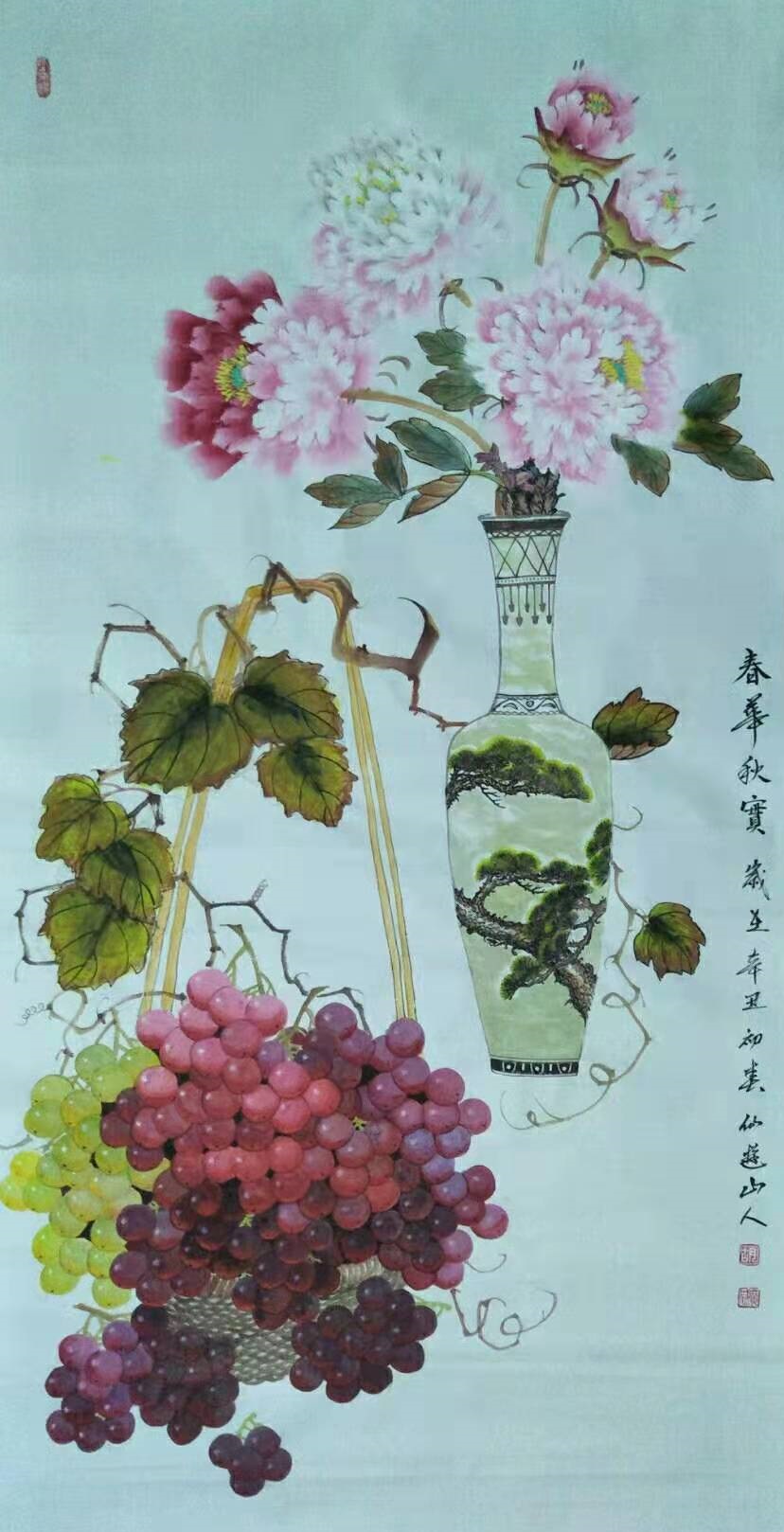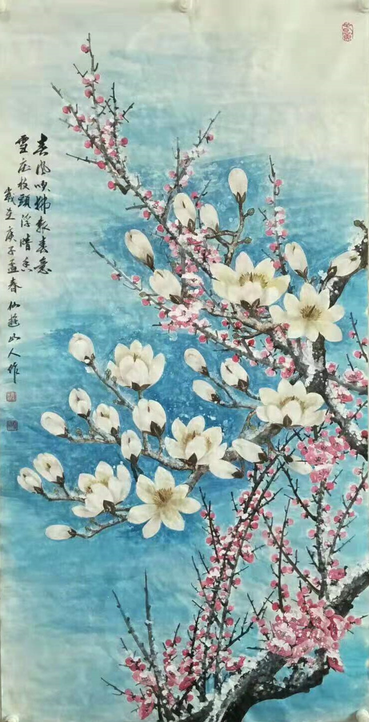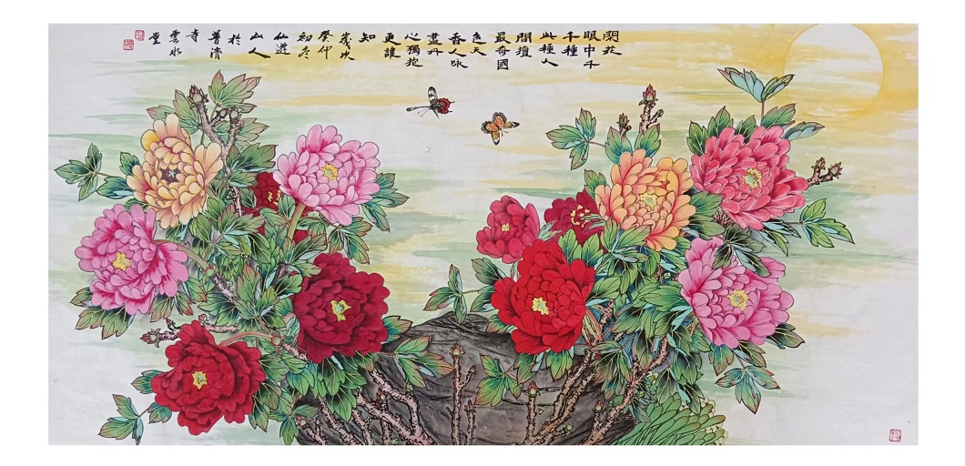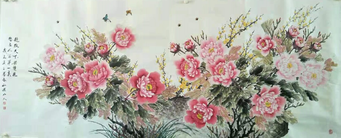 从丹青画作中来看,胡广成先生的笔墨之道无疑就是传统写意的正宗典范,不同于匠俗画家的复刻搬照,而是能在尽抒胸中逸气的基础上由技入道,从而使形与心手相凑而相忘!就比如在他的一幅牡丹作品,画中笔墨是可见工写兼备于一体,线条勾勒花卉形神,容雍中尽显华贵,墨色浸染怡情气象,虽艳丽却不妖媚,花图斗色争妍,枝叶偃仰相映,此真是画笔善状物,长于运丹青;丹青入巧思,万物无循形!理法相生,气机流畅,欣赏之余诚是可令人深感一股浓郁的诗情画意,见生机盎然,品国色天香,姹紫嫣红,沁人心神!