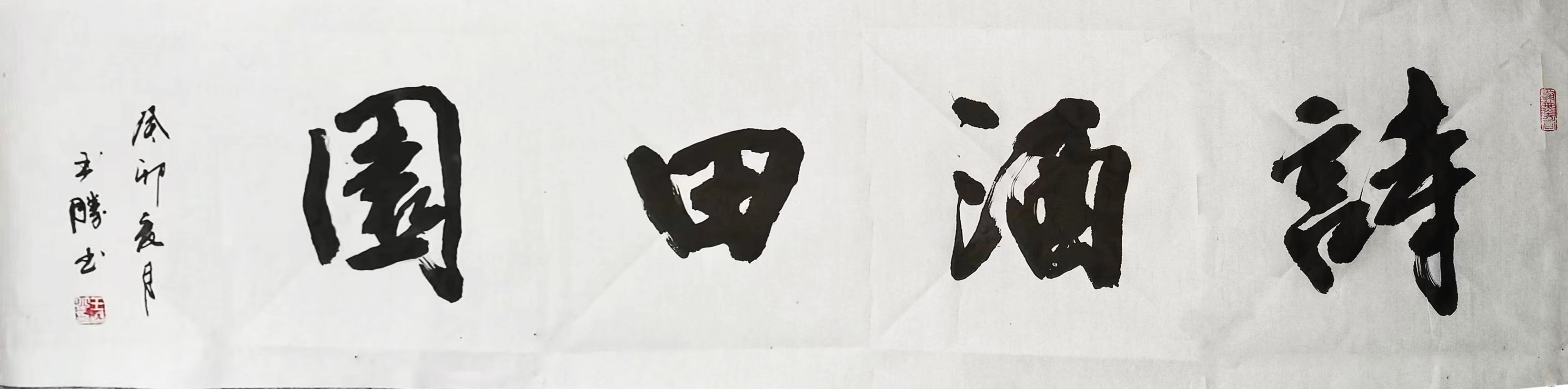 在行书作品中,王胜先生是主取于一股书卷之气,以二王法脉为宗基,同时又转师于苏轼、米芾、黄庭坚等诸家笔意,最终以各家总览为揣摩,自然也是胸中餍饫,腕下精熟!笔力千钧时可见劲逸丰腴,线条纵意时又可见偃仰险绝,横如千里阵云,肉中裹筋,竖如万岁枯藤,筋中藏肉,字字结体更是能够尽显峻秀之豪宕,每为一字,各象其形!纵览之余,诚是可感一点成一字之规,一字乃终篇之准也!