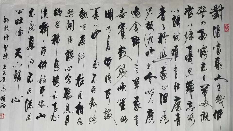 在创作上,程明海先生的笔墨挥毫虽然是师法正宗,但却又不是完全地被规矩格法所控制,当然也不是盲目随意的任性驱使,而是能千锤百炼后的取法积淀中融会于胸次,使笔墨不泥古法,不执己见,惟在活而已。一幅中笔毫既出,力道千钧时可透纸背,毫腹行进浑雄遒健,实乃劲者如武夫,锋纤往来时则似银钩,毫尖回转圆润细劲,更觉欹斜如醉仙!而如此神会的笔墨造化,也同样是能充分印证唐人张怀灌于《书艺》一书中所言,即智者无涯,法不固定,且以风神骨气者居上,妍美工用者居下也!