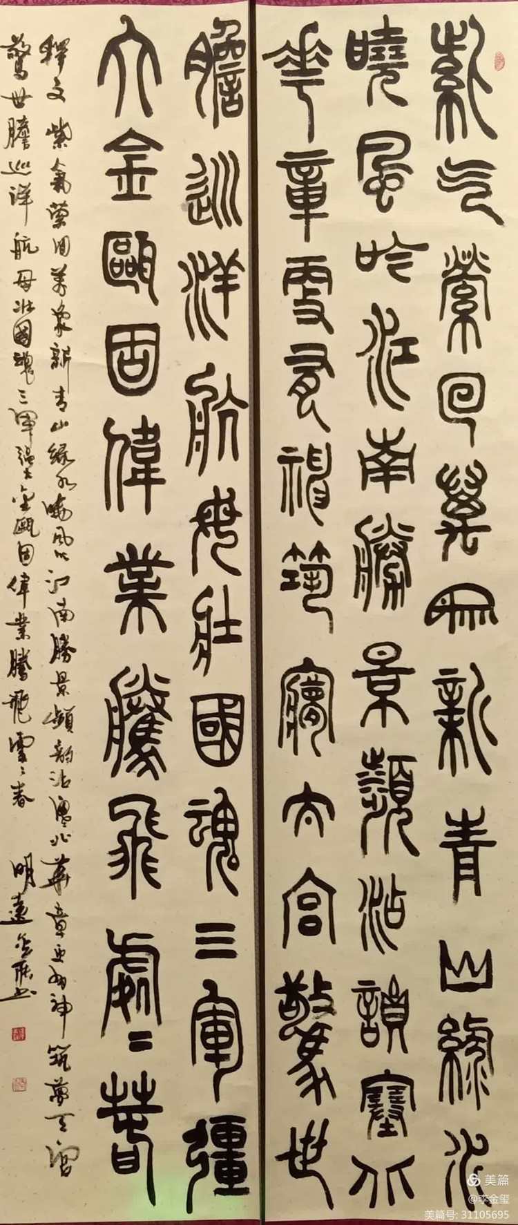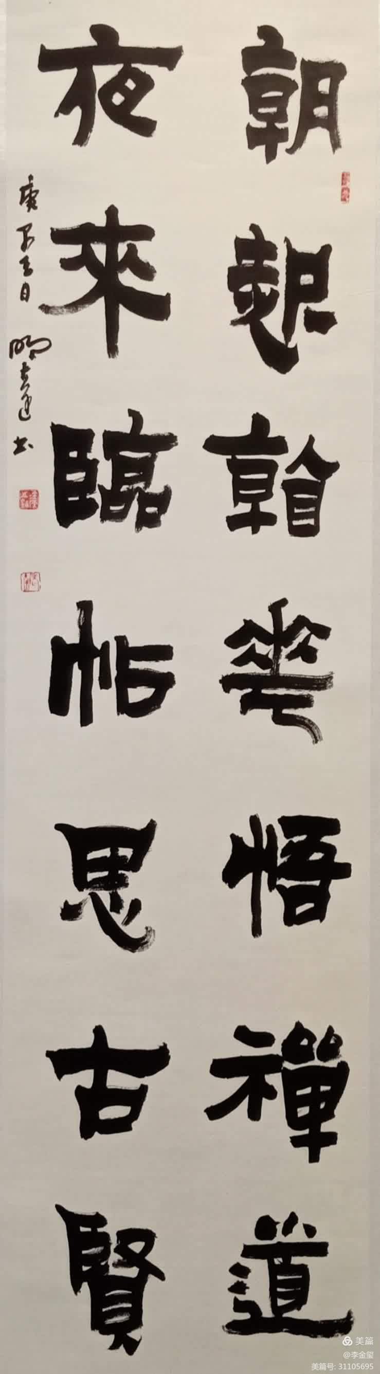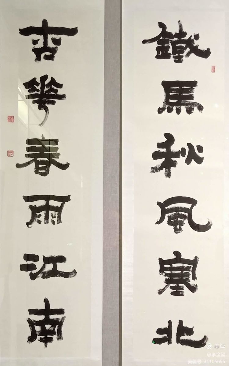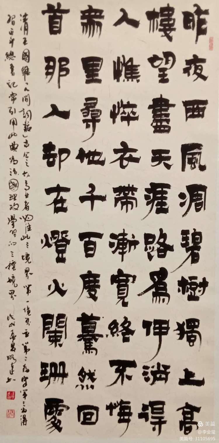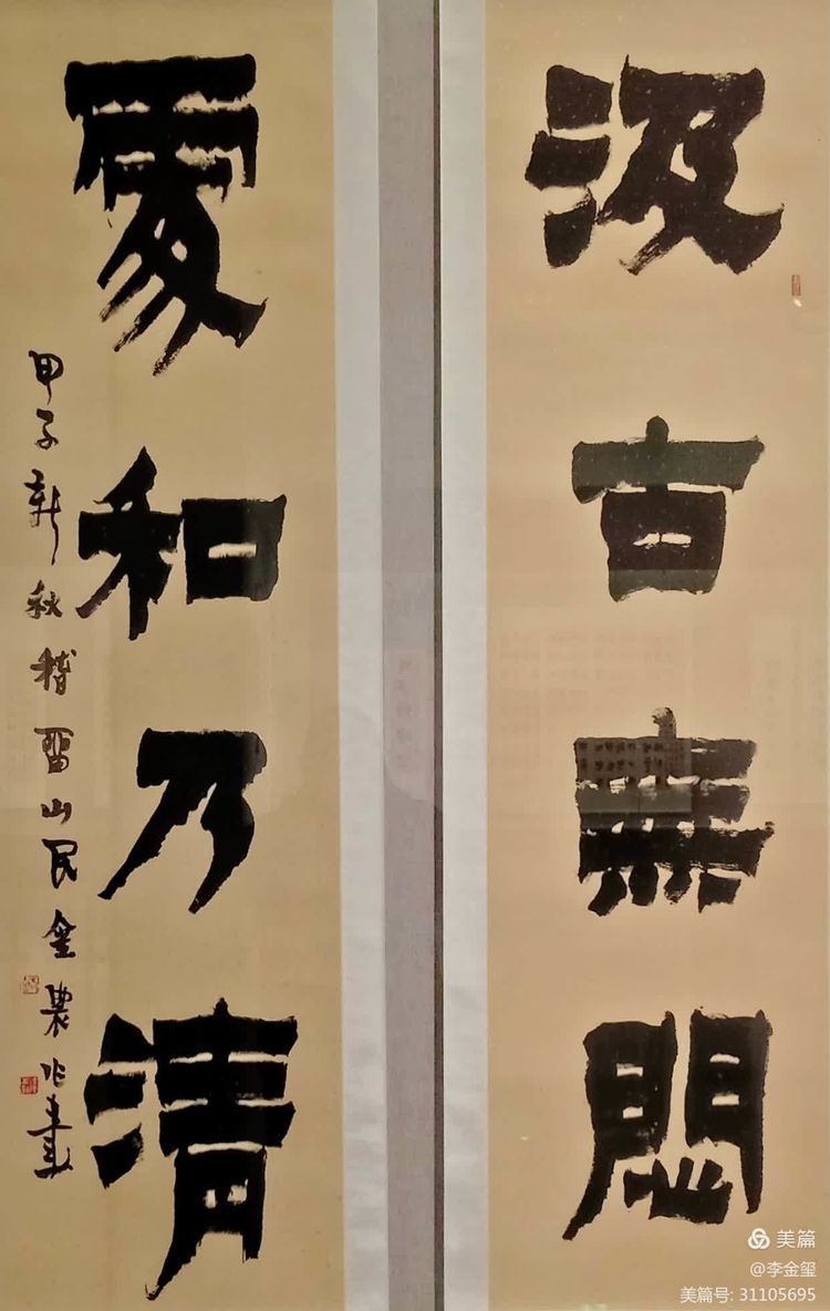 北方多是胸怀豪情之士,尤其内蒙地域,有草原之辽阔,骏马之奔腾,而出身于内蒙古的金侯先生自然也是有饱受这些丰富的人文滋养,从内蒙师范美院到首师大书法研究生的结业经历,再到今日兼任诸多协会、书院的高职名誉,这一路走来,金侯先生显然是有付出了极大的艺术心血和努力,此正如古人云,是谓故书也者,心学也;写字者,写志也。潜心翰墨数十余载,取法金农不遗余力,是能以真正的文人精神求索问道,更是能以非凡的笔墨功底树立勋猷,最终令一幅幅漆书作品可以展现出与众不同的性情境界!心追手摹,得其神韵,渐老渐熟,斯为大成!