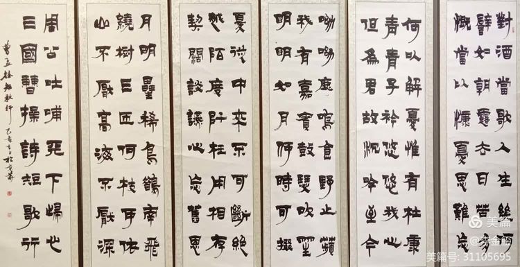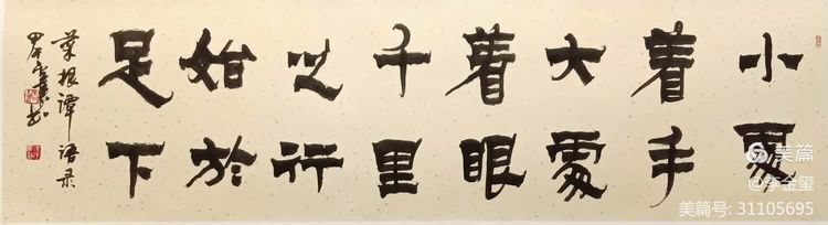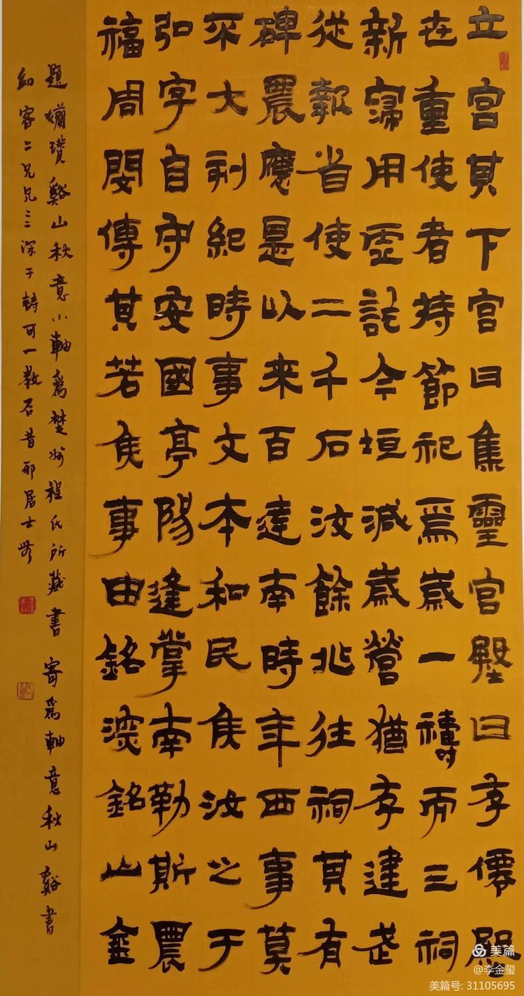 取法承古以立今 书风正大而超群。从当代书坛来看,漆书的创作还是比较曲高寡合的,毕竟在流行书风盛行的时代背景下,能坚守传统书道的人本就不多,而从艺漆书的人则就更是少之又少。但幸运的是,当今还是有一小部分像金侯先生这样的书法家,可以在传承和发扬漆书文化的道路上秉持初心,并通过不断的创作实践来让更多人能够了解到漆书文化的艺术魅力!正如金侯先生在简介中所说,誓做塞上漆书的传承人,而今日欣赏他的众幅漆书作品,其漆书造诣显然也是完全无愧于此高誉!功不欺人,法不欺世,知行合一,名副其实!