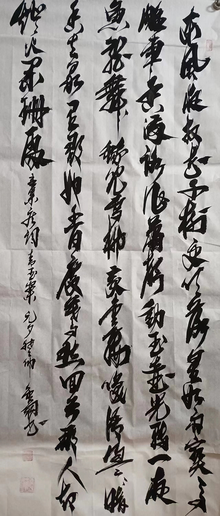 王金朋先生非常具备一个艺术本科生的内心修养,其书法在张书范老师亲授下,找准了目标,在晚明张瑞图风格基础上,揉进了王羲之书法方笔出锋的特点。囊括万殊,裁成一项,真正形成了自己的风格,人称,水星张瑞图,金星王金朋。