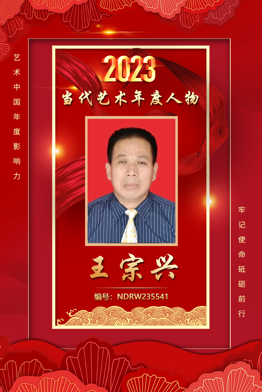 王宗兴,男,字墨言,安徽宿州市砀山县人,职业教师,现为安徽省第八批乡村振兴下派干部。1966年出生,57岁,中国硬笔书法家协会注册书法教师。从小受父亲影响一直喜爱书法,2006年开始正式习练书法,在家父指导下先练唐楷,后练行草诸体,技艺渐进。尤其擅长行、草书和毛体书法,作品多次参加今日头条、百度等媒体举办的国家级书法大赛及书展,曾获一等奖1次,金奖3次,二等奖1次,三等奖2次。曾有三幅作品被编入《中国当代优秀书画家作品集》。