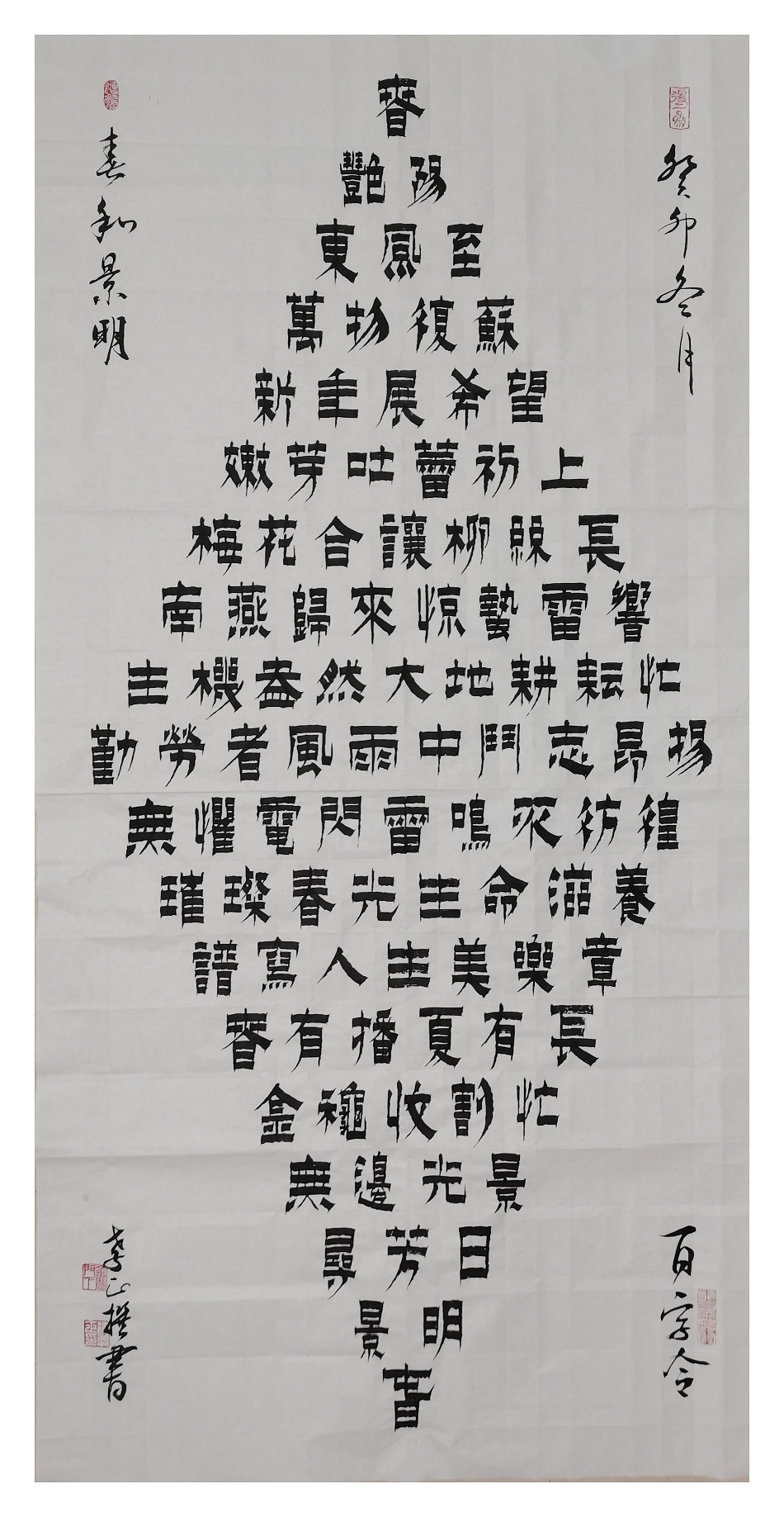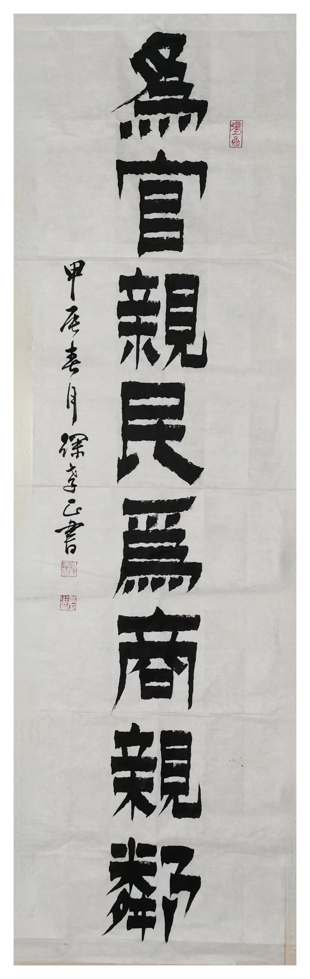润德先生之书法幼承家学,步入社会,工作之余,仍砚田笔耕,临池不辍。浸淫于真草隶篆,留意于汉简秦碑。后又师从中国著名创意书法家徐志康先生,潜心研习金农“漆书”多年。长期的遍临诸帖、博采众长,使其成了当今的“金农门下”。