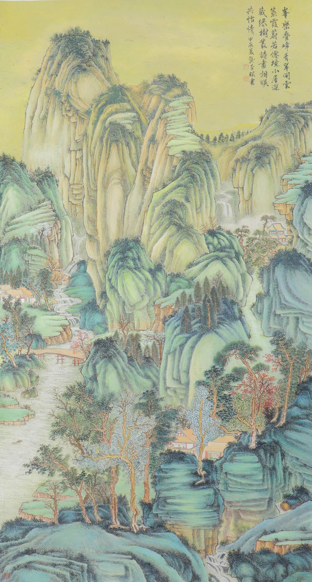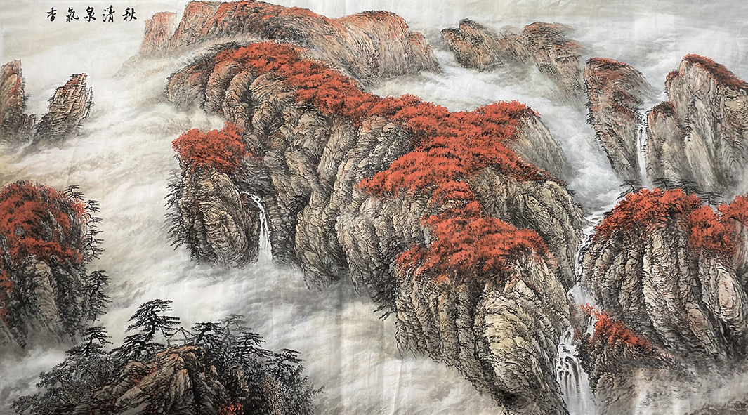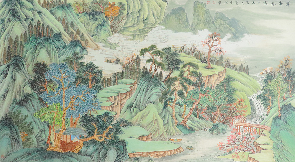 龚李琪老师的山水画为我们展示了优美的画卷,自然的谐趣,在他的画里展现得淋漓尽致,山水的转换,高低错落,前后回旋表现了山川自然的变化。龚李琪老师的作品不仅构图新颖,设色靓丽,而且笔墨晕染下的云雾缭绕,曲径通幽,将春的山水之色绘色于纸上,引人入胜,叫人恍梦离俗。岩崖古石,将山水的自然天成推至眼前,温柔而充满意趣!